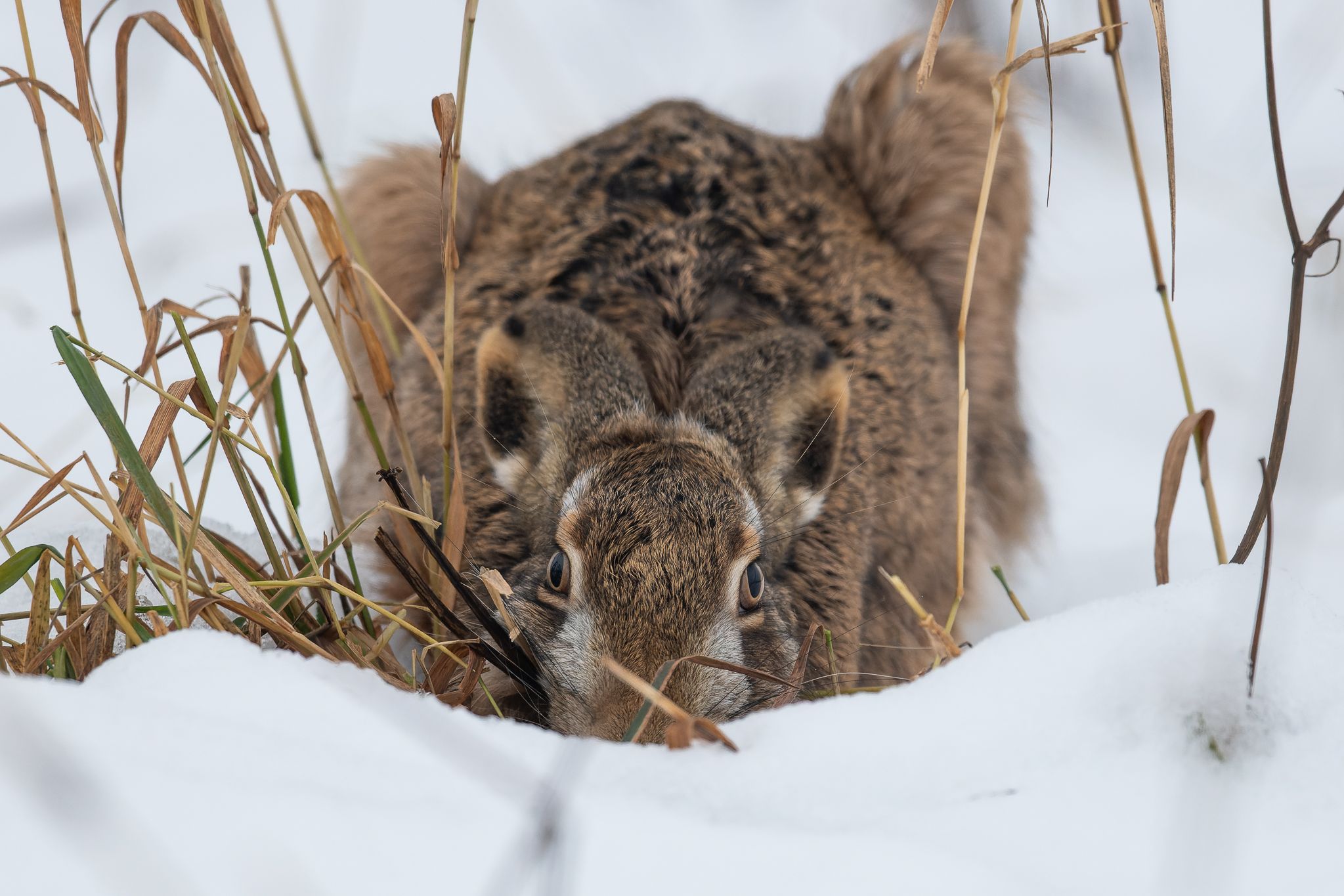 Очень интересный ракурс. Сам заяц замечательный, но и ещё его фигура выглядит похожей на голову верблюда или коалы, неожиданного на снегу. Зрительная иллюзия.
