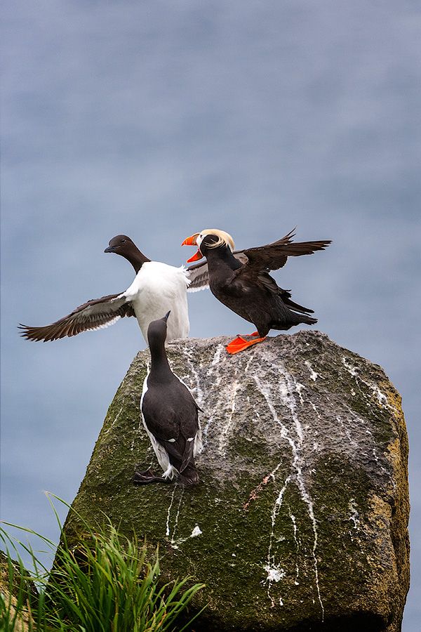 Морские птицы идеально приспособлены к жизни в бескрайних океанских просторах , их способность нырять и добывать пропитание под водой приводит в изумление . Они не просто ныряют в толщу воды , но ещё и плавают там с поразительной скоростью , настигая добычу . Однако , многие из них не обладают способностями к виртуозному полёту , а особенно к маневрированию в полёте . Да и взлёт - посадка для них тоже достаточно непростой процесс , а учитывая , что их гнездовые участки находятся на птичьих базарах , с очень высокой плотностью птиц на единицу площади , понимаешь как непросто им покинуть и вернуться к насиженному месту . Зачастую эти манёвры порождают немалое количество инцидентов между птицами , свидетелем чего я и явился , запечатлев момент приземления толстоклювой кайры ( не совсем удачного с точки зрения топорка )