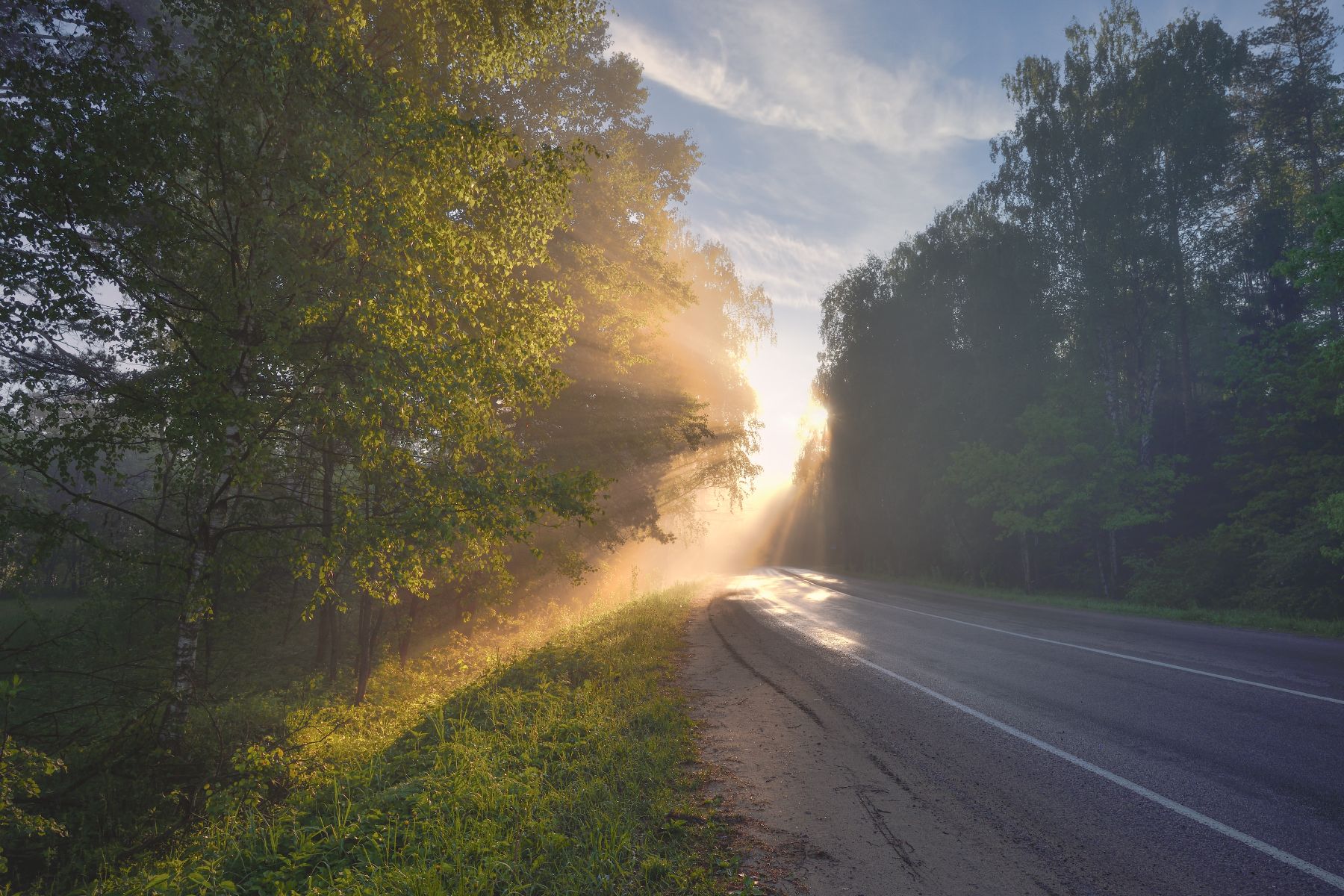 утро,рассвет,шоссе,солнце,лучи,туман,небо, Виталий Полуэктов