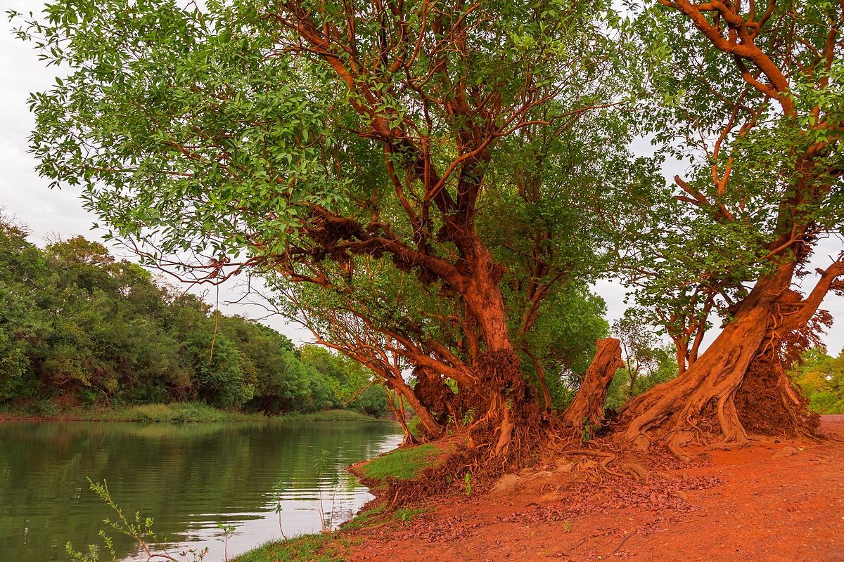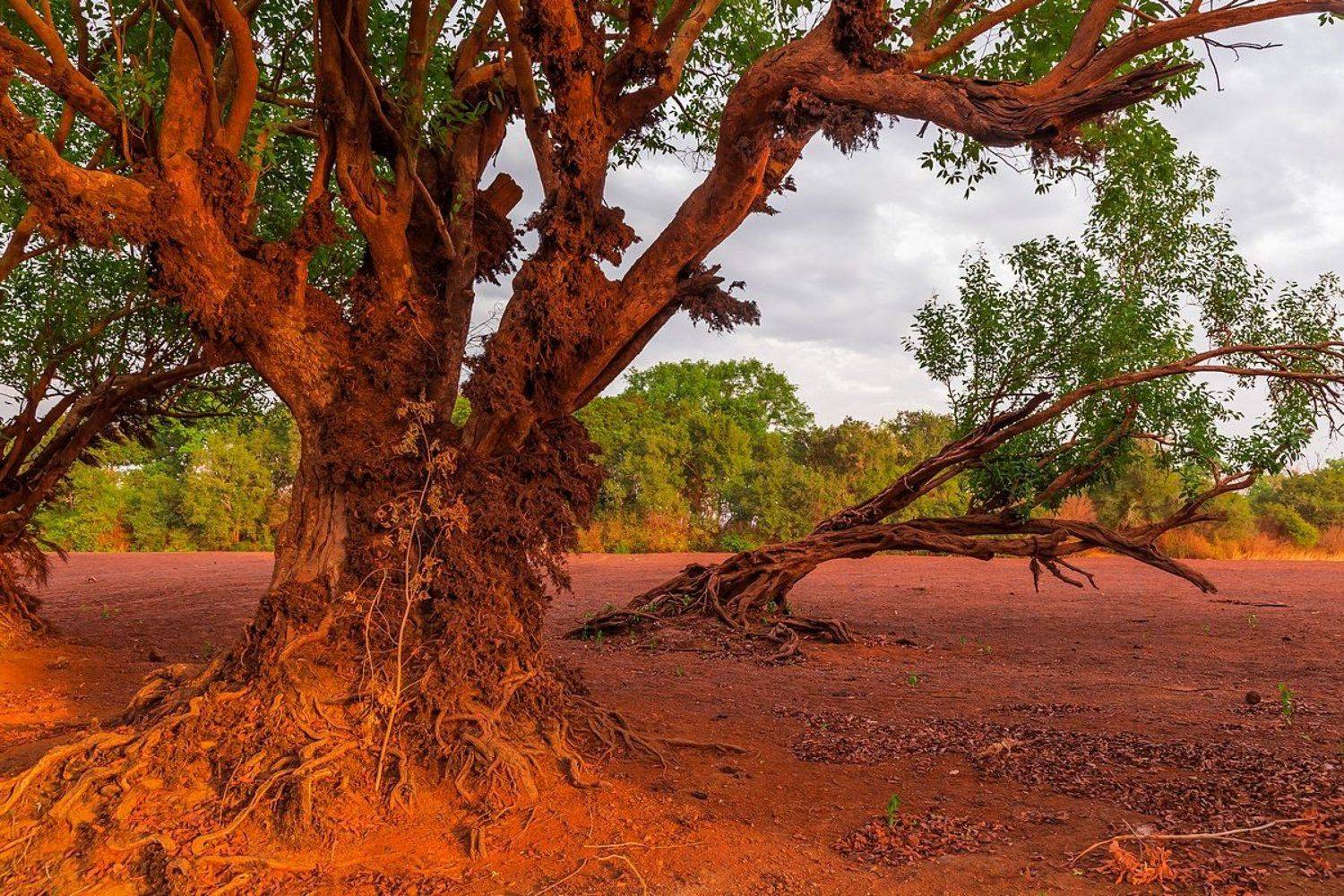 В долине реки Тинкиссо растут удивительные деревья. Они единственные, кто способны устоять напору разбушевавшейся реки во время летних дождевых паводков. А находясь под водой, стволы деревьев пускают побеги в виде мелких корешков, по высоте произрастания которых можно определить масштаб периодического паводка. Провинция Кан-Кан, республика Гвинея, западная Африка.