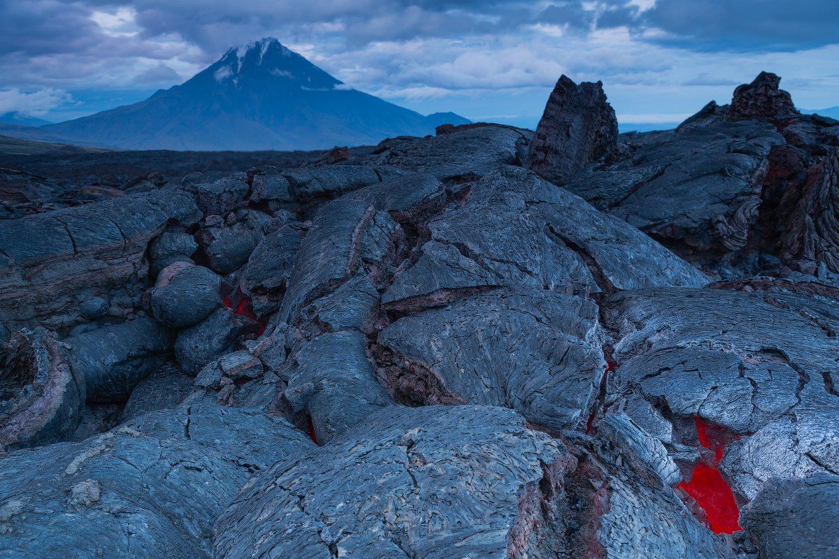 Прошел год после окончания извержения вулкана Толбачик, а в недрах лавовых полей все еще очень жарко. На дальнем плане вулкан Удина.