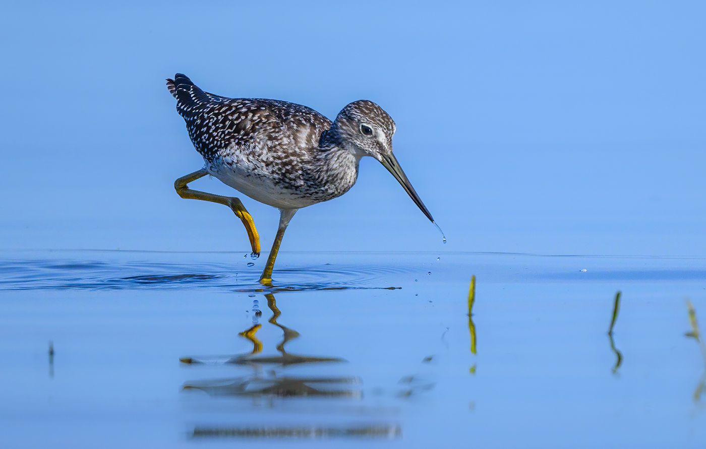 The greater yellowlegs (Tringa melanoleuca) is a large North American shorebird. The genus name Tringa is the New Latin name given to the green sandpiper by Aldrovandus in 1599 based on Ancient Greek trungas, a thrush-sized, white-rumped, tail-bobbing wading bird mentioned by Aristotle.