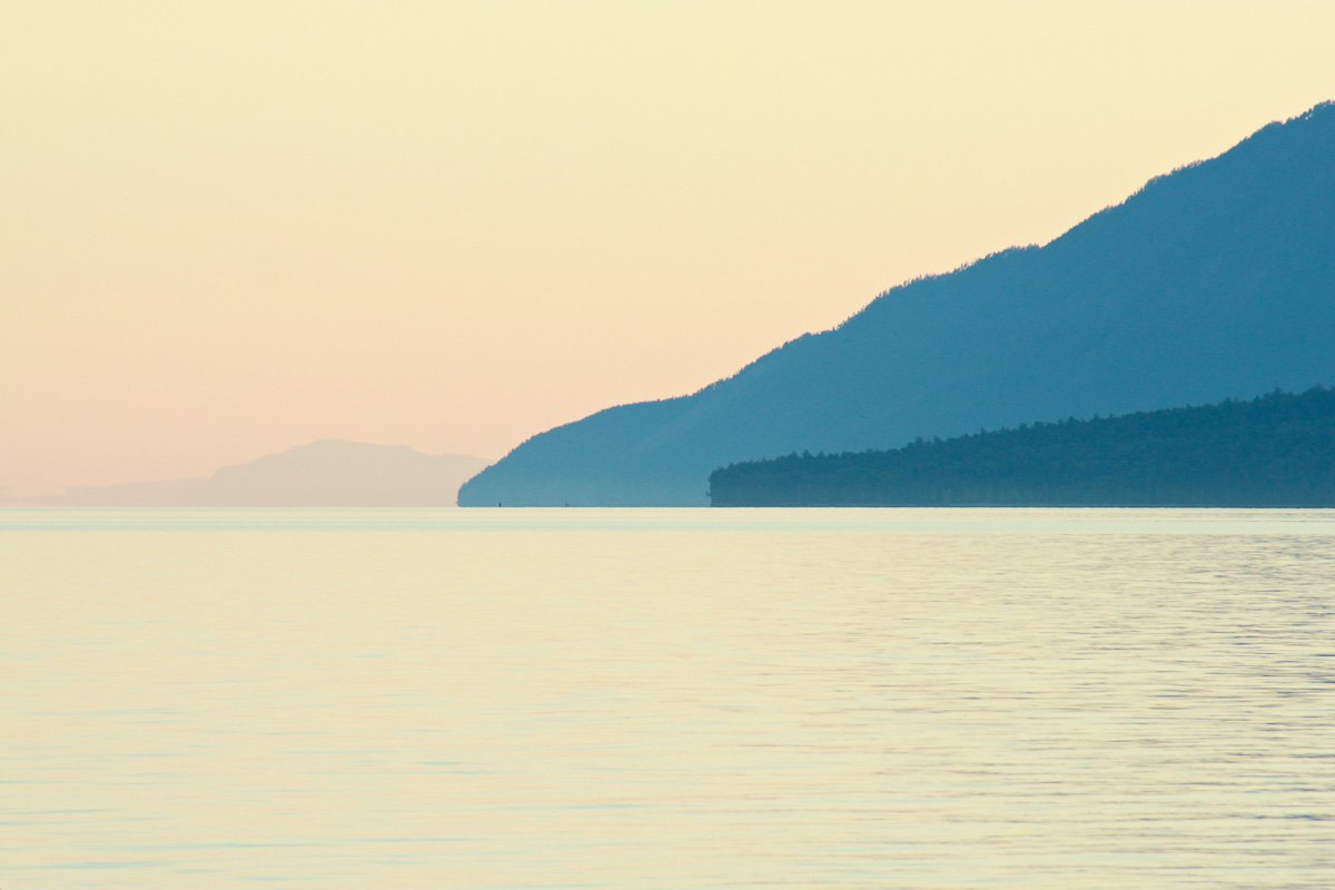 Солнце только скрылось за горизонтом, и небо окрасилось в необычные цвета. Благодаря тихой погоде видна оконечность Святого Носа и остров Ольхон вдалеке