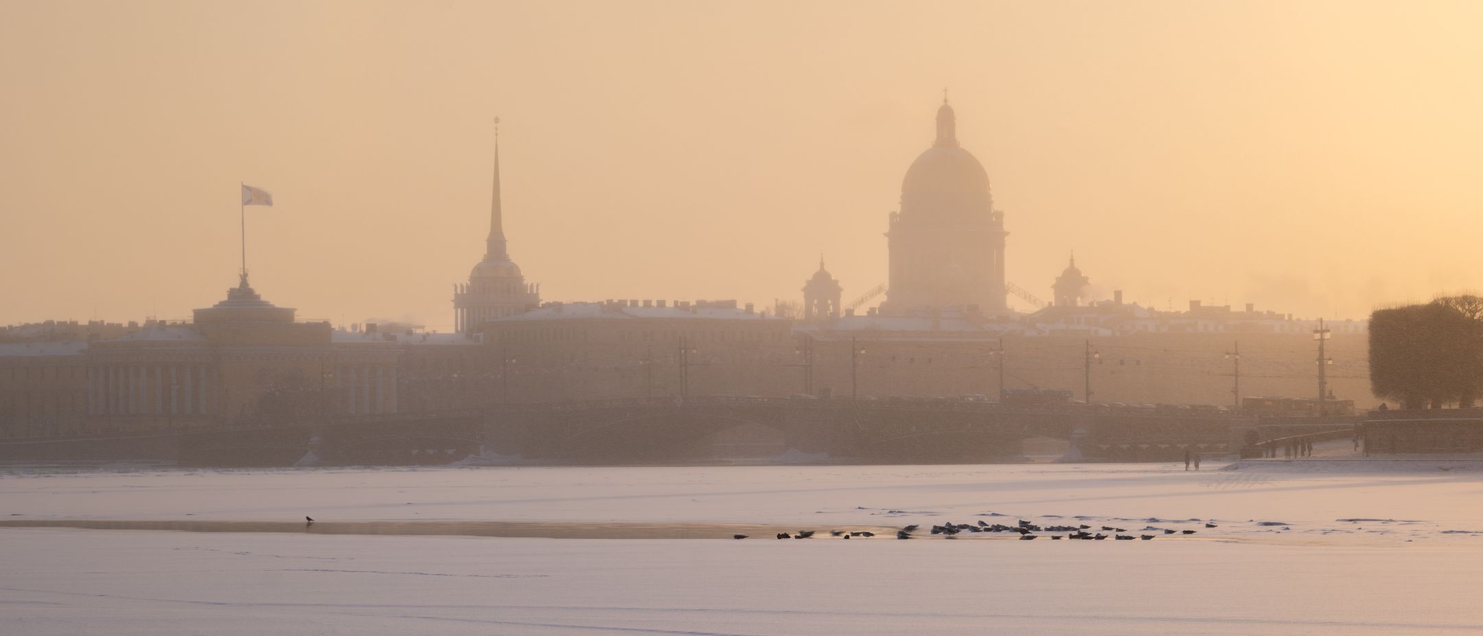 Вид на Исаакиевский собор и адмиралтейство со стрелки Заячьего острова. Санкт-Петербург, январь 2023.