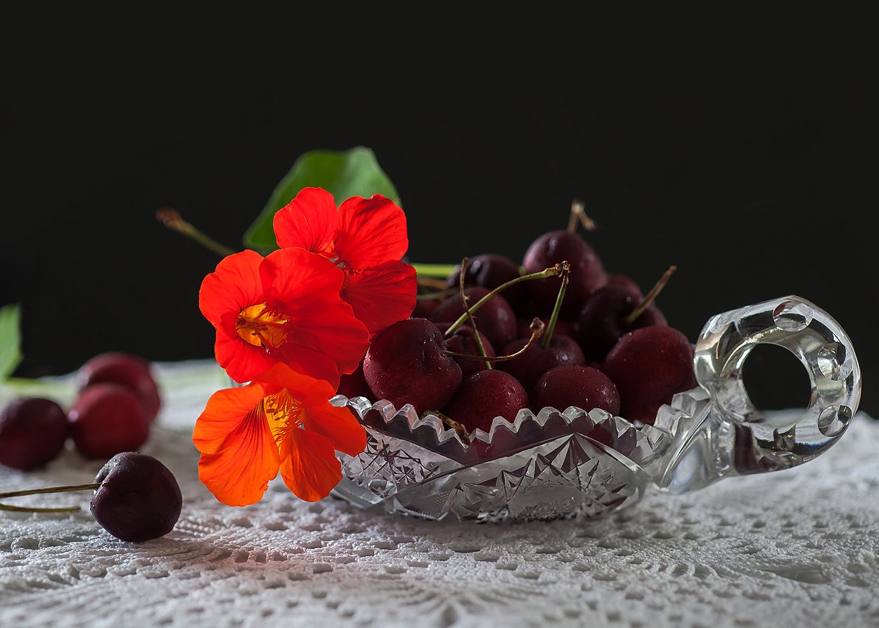 Gratulálok, remek és teljesen egyértelmű a kép, a szép kristály tartóban a duzzadó , hamvas cseresznyeszemek, melyek a női testet szimbolizálják, a piros virág pedig az érzelmeket. ennél több nem is kell, a képben minden benne van .