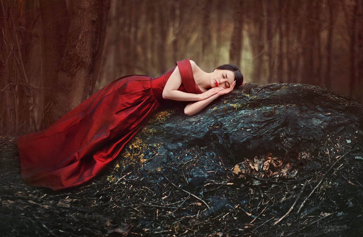камень, красное платье, портрет, девушка, модель, сон, Шиленок Елена