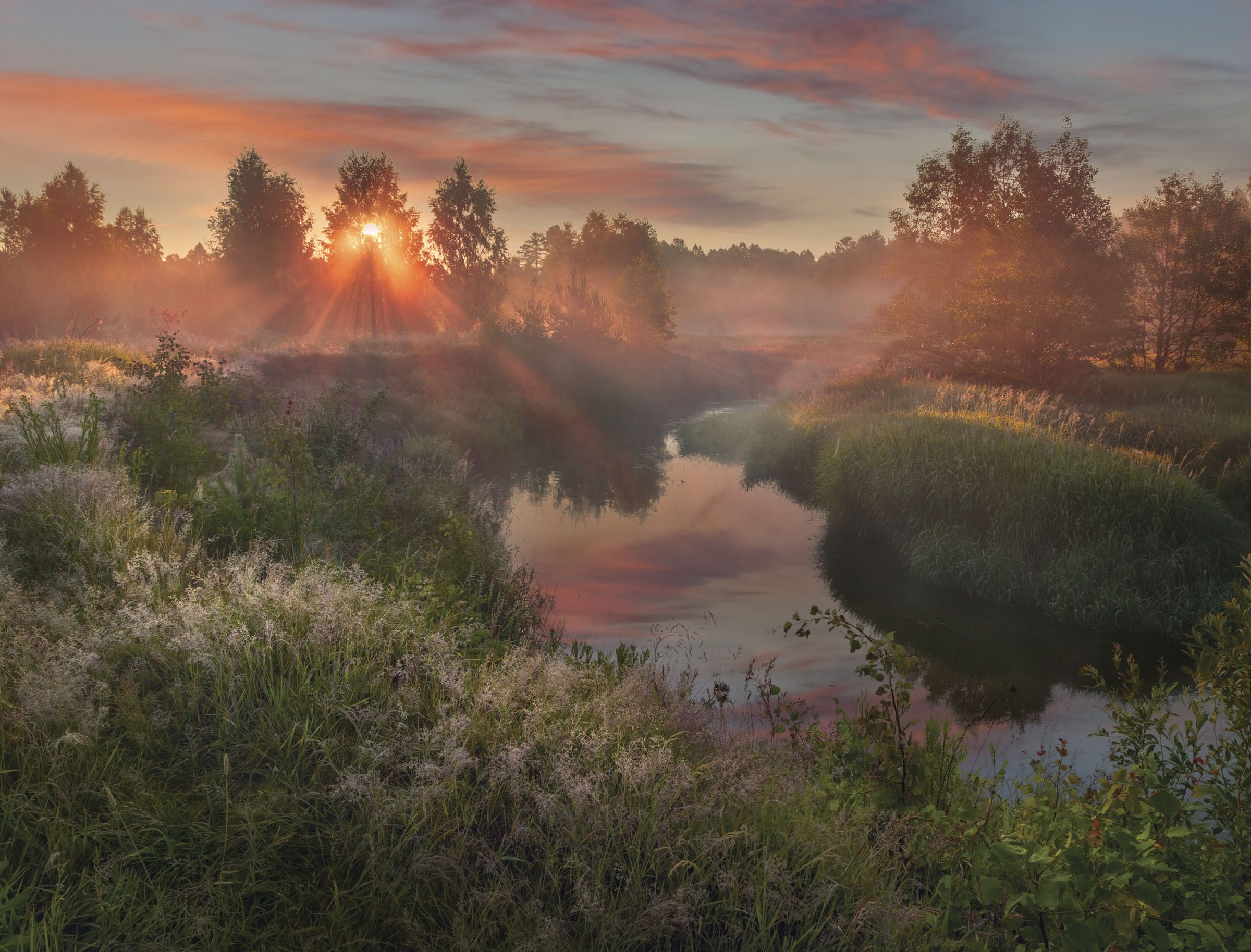 Быстро собрал дрон, взлетел еще до подъема солнца над горизонтом. Когда дрон поднялся, я увидел восходящее солнце. Сверху его было видно, но здесь внизу все было еще в тени. Волшебство мест возле реки поразило меня. Полетав, я пошел по изгибам реки к мосту. Трава, вся в обильной росе, была очень высокой, и местами я утопал в ней по пояс. Наконец вышел на относительно высокий берег, солнце уже поднялось и брызгало раскидистыми лучами сквозь туманные деревья. В одном месте я остановился и сделал несколько серий снимков с разной экспозицией, чтоб проработать тени и света. Сделал три серии с немного разных локаций. Но снимки менялись кардинально, даже если сместиться всего на полметра. Лучи брызгали из-за деревьев, делая картины окружающих мест, совершенно непохожими друг на друга. Поворот камеры на 20-30 градусов и лучи исчезают, и меняется вся картина полностью. Меня захватила эта феерическая симфония диковинных лучей с росистыми берегами и рекой. Было три часа сорок минут.