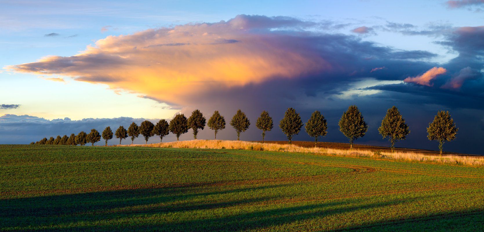 На холме вдоль горизонта выстроилась линия деревьев, отбрасывающих длинные тени на зелёное поле. Небо над ними — драматическое, с оранжевыми и тёмными облаками, предвещающими дождь. Свет заката придаёт сцене спокойную, почти мистическую атмосферу. Фотография передаёт тишину и красоту природы в момент перехода от дня к ночи.