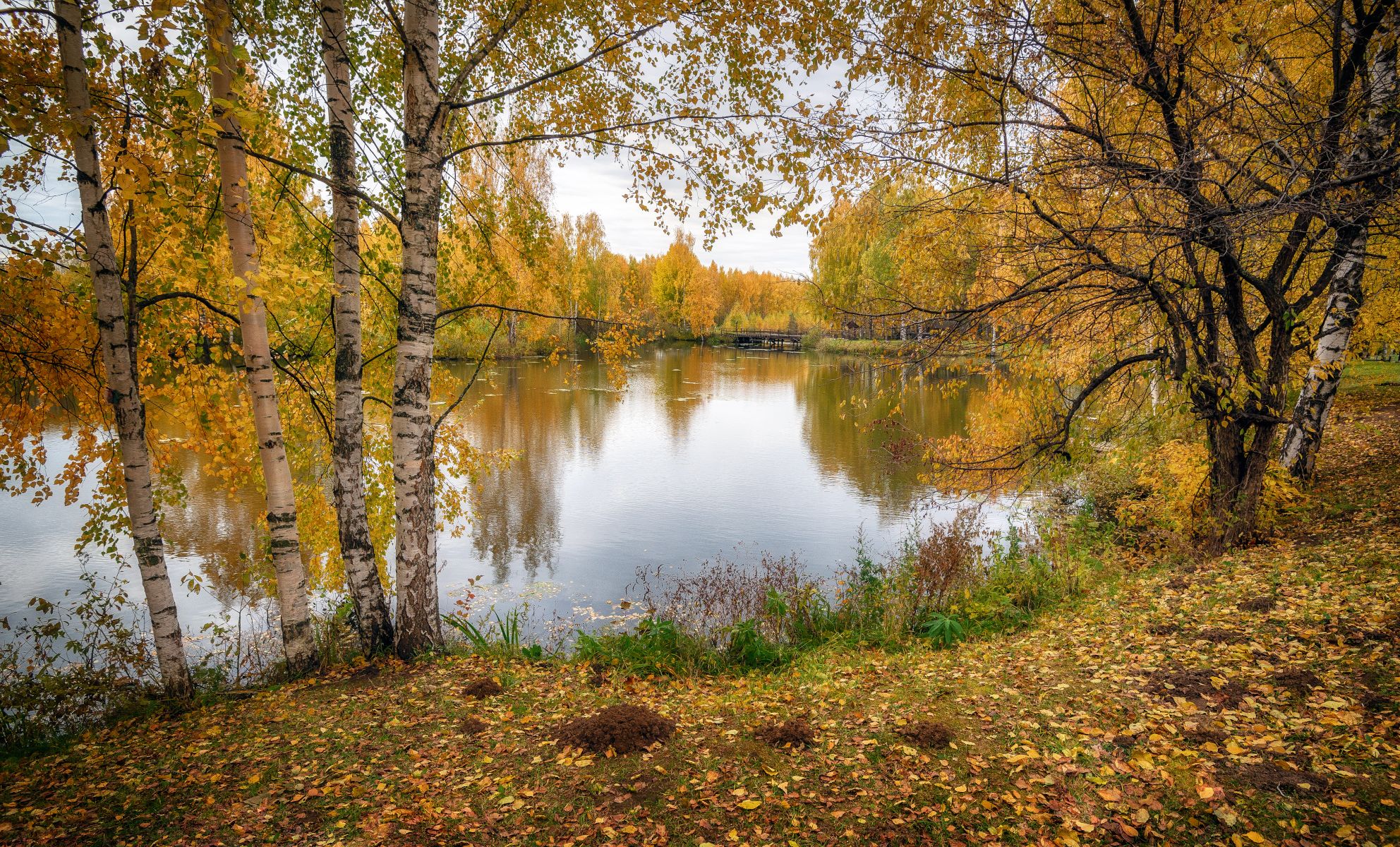 река, осень, листья, берёзы, октябрь, Сергей Аникин