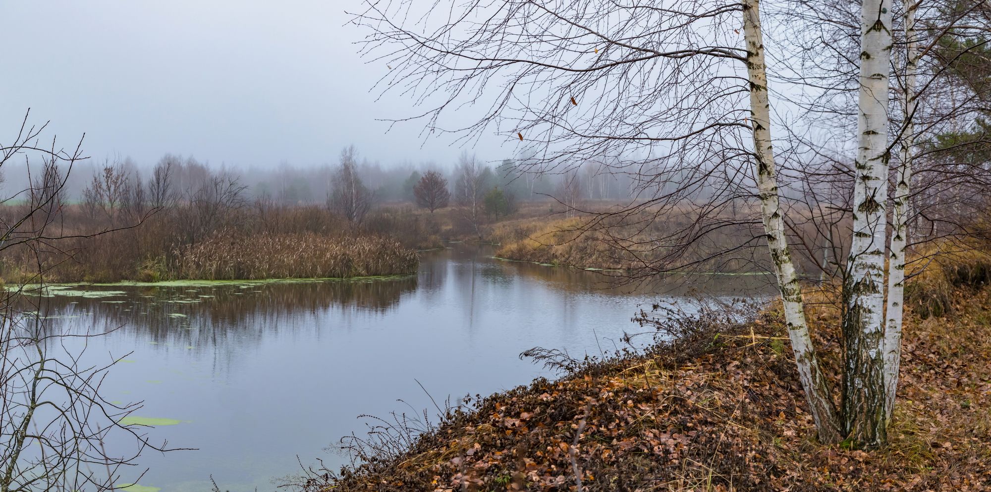 река, туман, осень, березки, пейзаж, Юрий Морозов