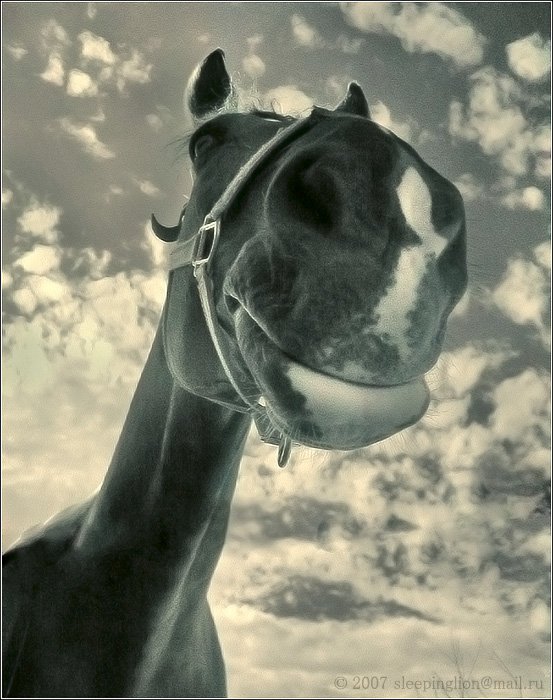 Portrait in Infrared. Конь - полицейский, порядок в парках охраняет. Из-за этого такой грозный. Древний 2.0mp Olympus C-2000Z, 760nm no name ИК-фильтр, широкоугольная насадка 0.8Х Olympus В-28.