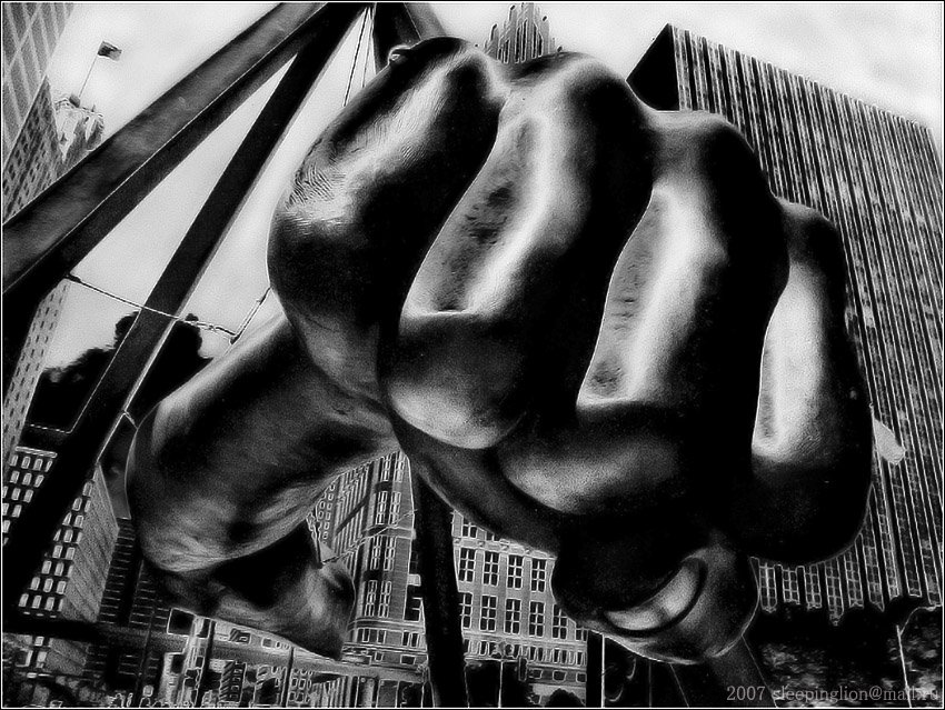 Памятник Джо Луису в Детройте. Снято с рук. 2.0mp Olympus C-2000Z, 760nm no name ИК-фильтр, широкоугольная насадка 0.8Х Olympus В-28. Solarization, dodging, burning.