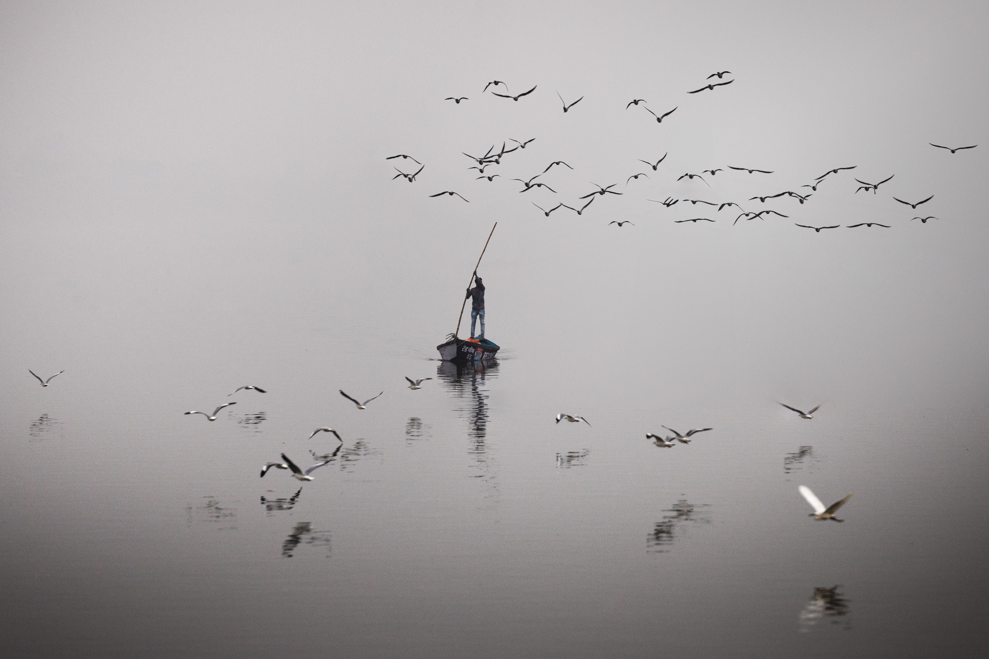 На тихой, зеркальной поверхности воды, окутанной туманом, одинокий рыбак стоит на лодке, подняв удочку. Вокруг — стая птиц, кружит и отражается в воде. Черно-белая палитра усиливает атмосферу спокойствия и размышлений. Фотография передает не только сцену рыбалки, но и внутреннее состояние — ожидание, мечту, связь с природой. Это не просто момент, а метафора утреннего начала, где человек и природа сливаются в едином ритме.