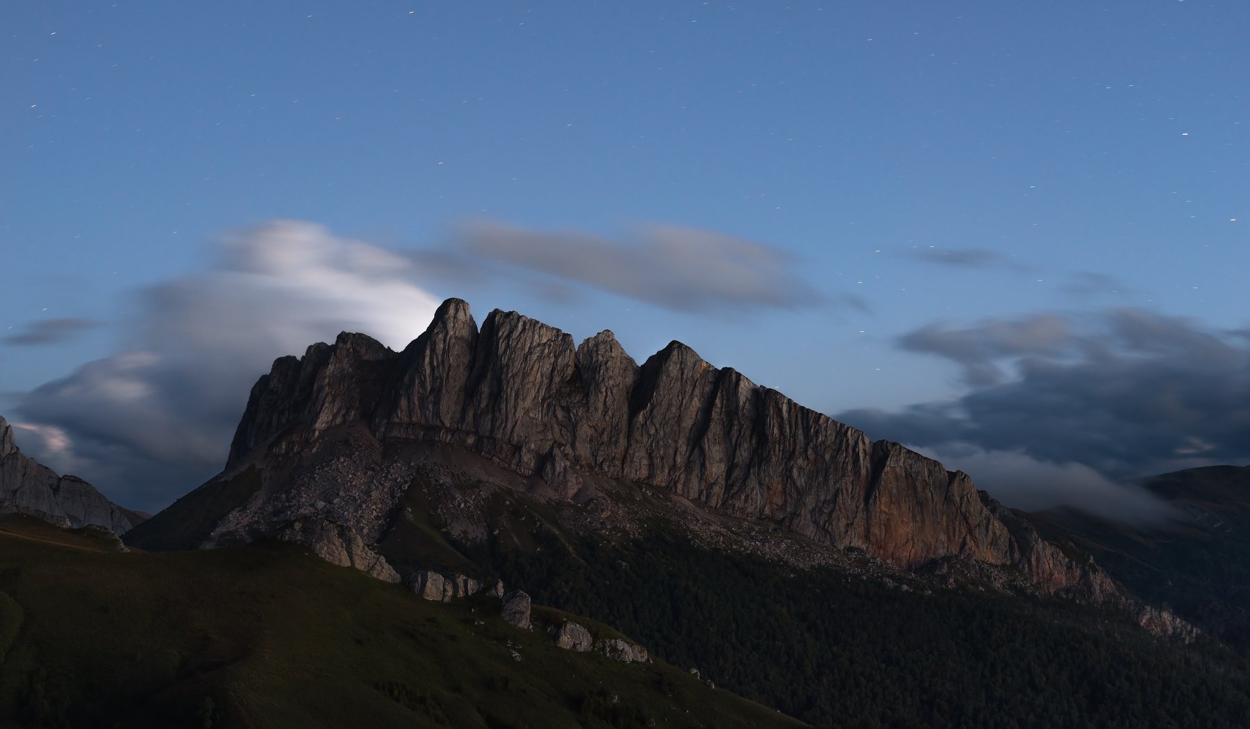Почти ночь , на небе уже звёзды . Не хочется возвращаться в лагерь , хочется стоять тут и смотреть ! Гора западный Ачешбок - спина доисторического ящера . Природный парк Большой Тхач.