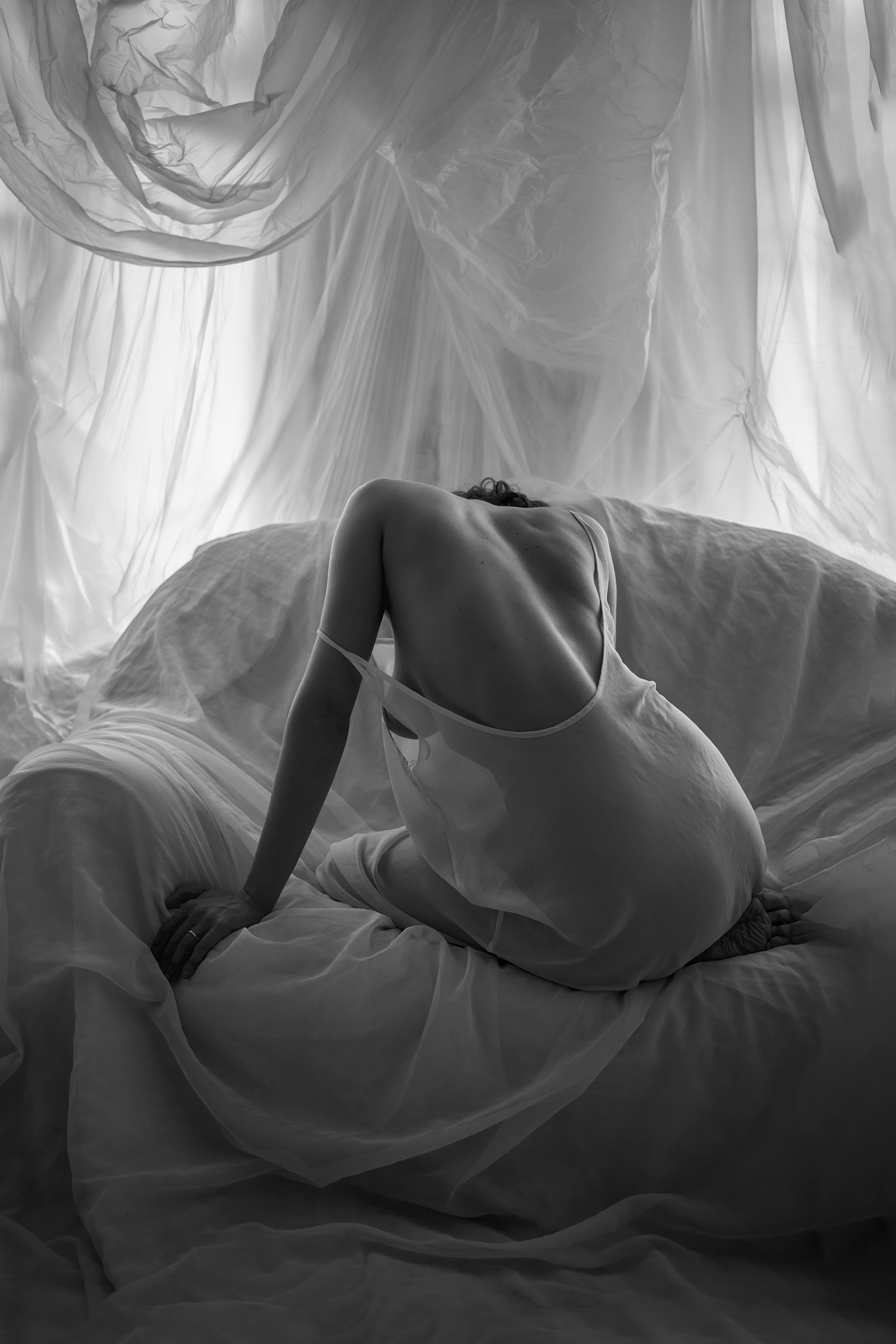 На снимке Антон Покровский запечатлел женщину в тихом, почти медитативном состоянии. Она сидит на кровати, согнувшись, в простом платье, её тело погружено в полумрак, пронизанный мягким светом, проникающим сквозь тонкие шторы. Сцена передаёт ощущение уединения, внутренней сосредоточенности и утреннего пробуждения. Черно-белая палитра усиливает атмосферу спокойствия и эмоциональной глубины. Фотография — не просто портрет, а фрагмент личного времени, застывшего в мгновении.