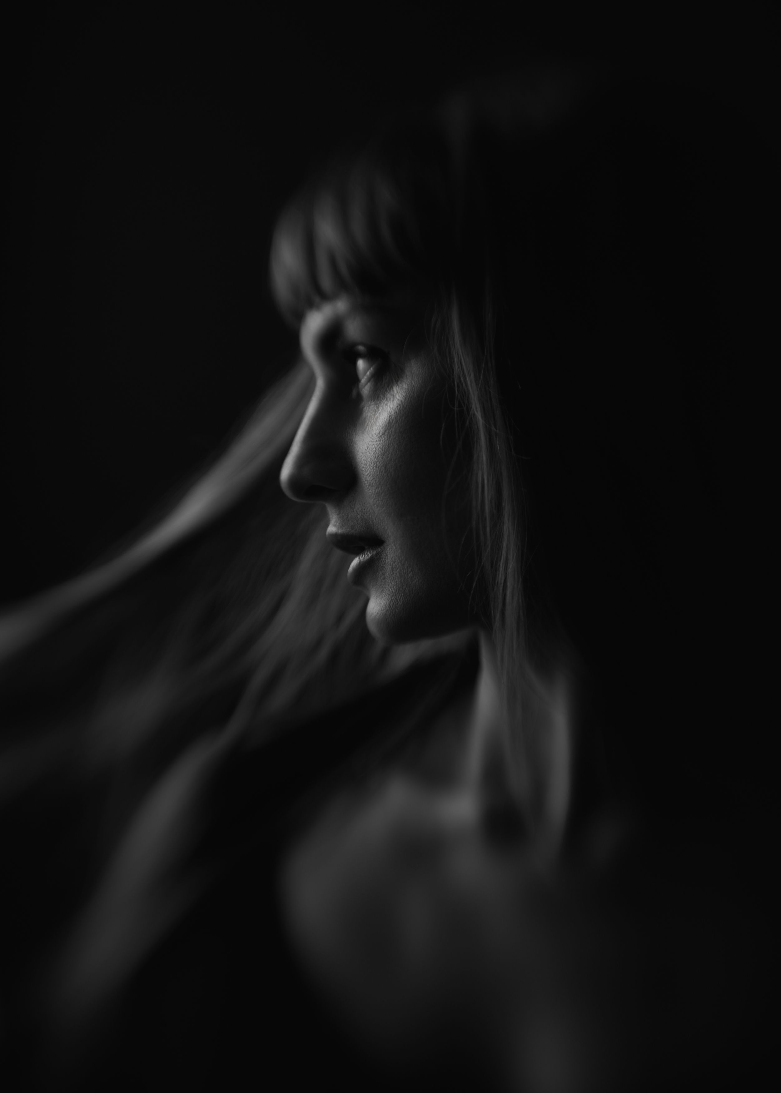 Свет ложится на профиль с тонкой точностью — тени и контуры создают почти скульптурную выразительность, а движение волос добавляет динамику без потери спокойствия.