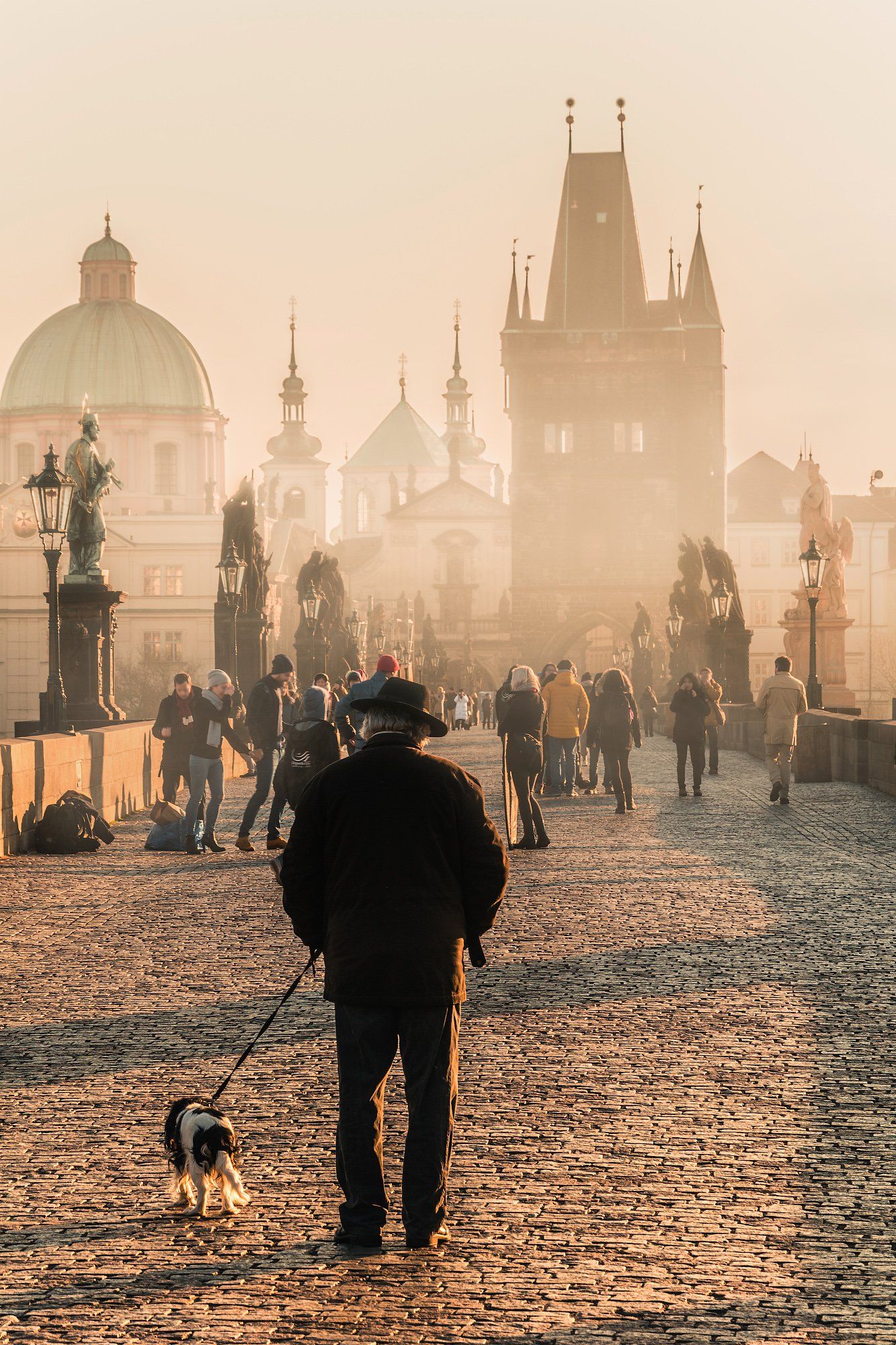 прага, рассвет, огонь, утро, город, башня, небо, облака, карлов мост, собака, человек, статуя, Денис Полтораднев