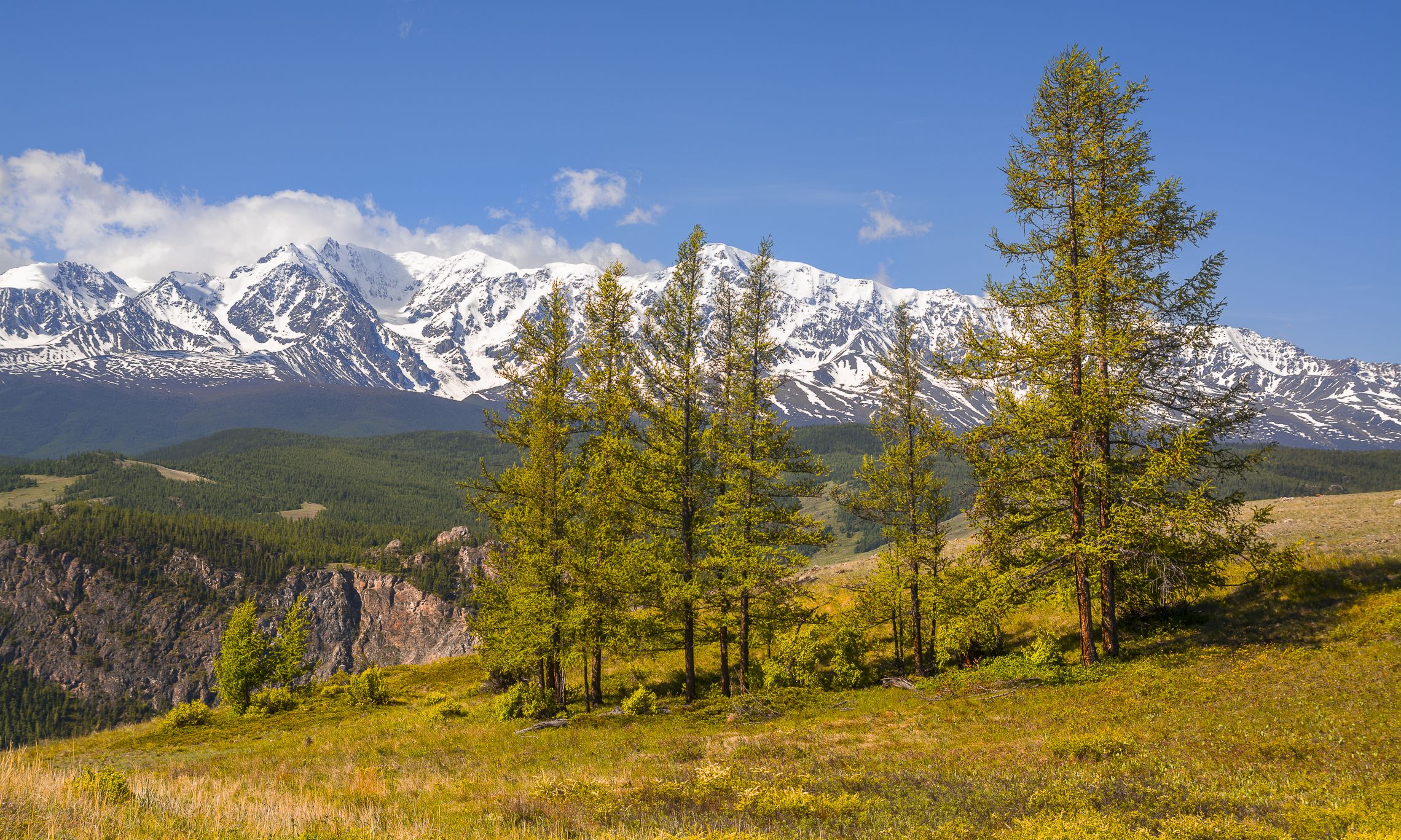 россия, горный алтай, лиственницы, горы, снежники, Андрей Поляков
