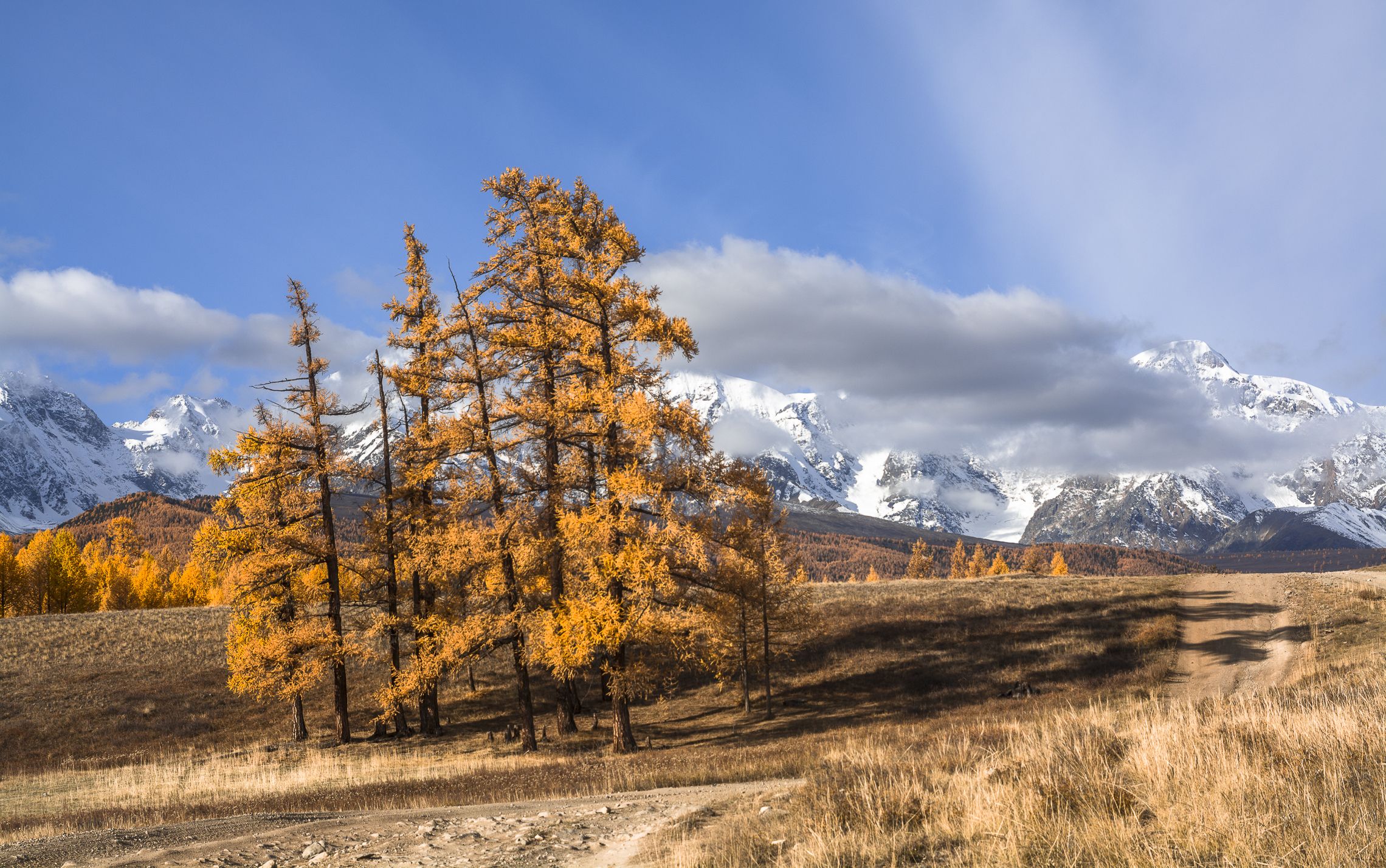 россия, горный алтай,лиственницы, горы, белки, (высота гор здесь м.б. свыше 4000), осень, утро, Андрей Поляков