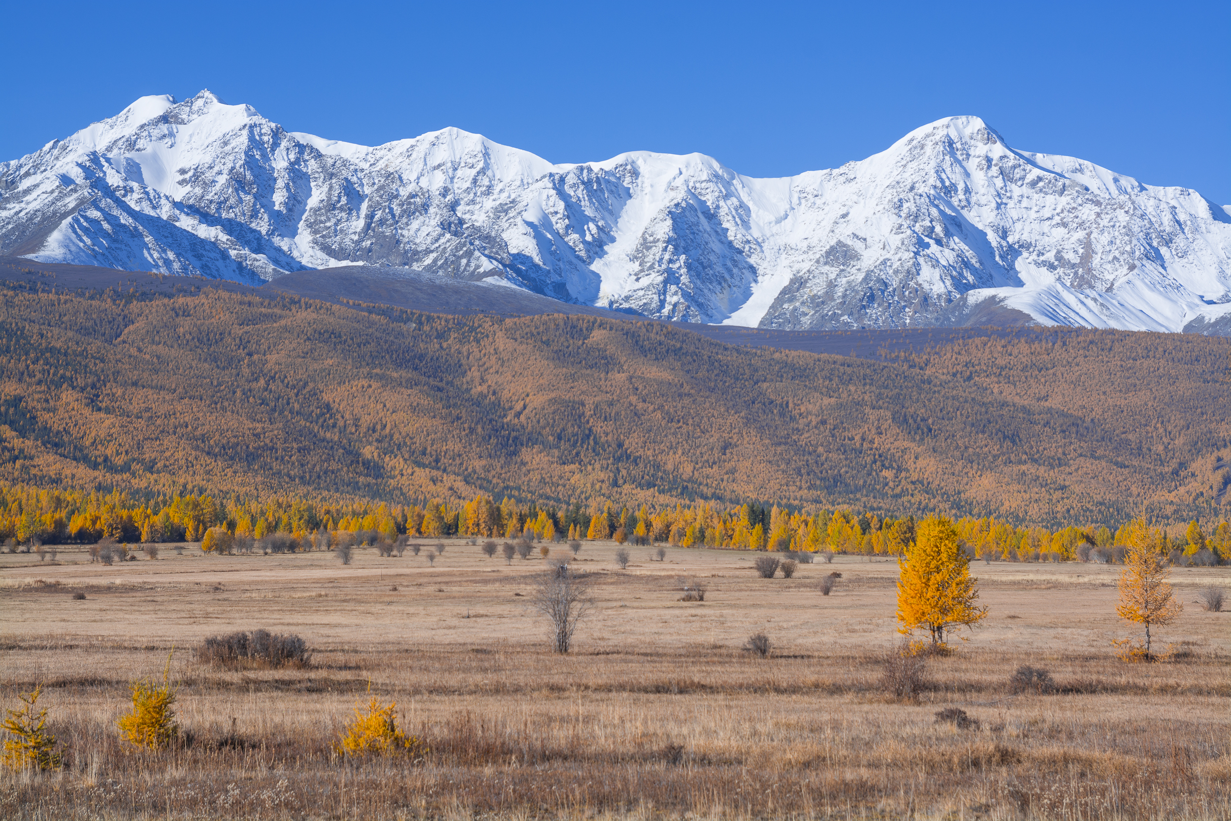 Снимок передаёт ясный осенний день в Горном Алтае — снежные вершины на фоне чистого неба, золотистые деревья в долине, сухая трава на переднем плане. Композиция сбалансирована, свет хороший, детали чёткие.