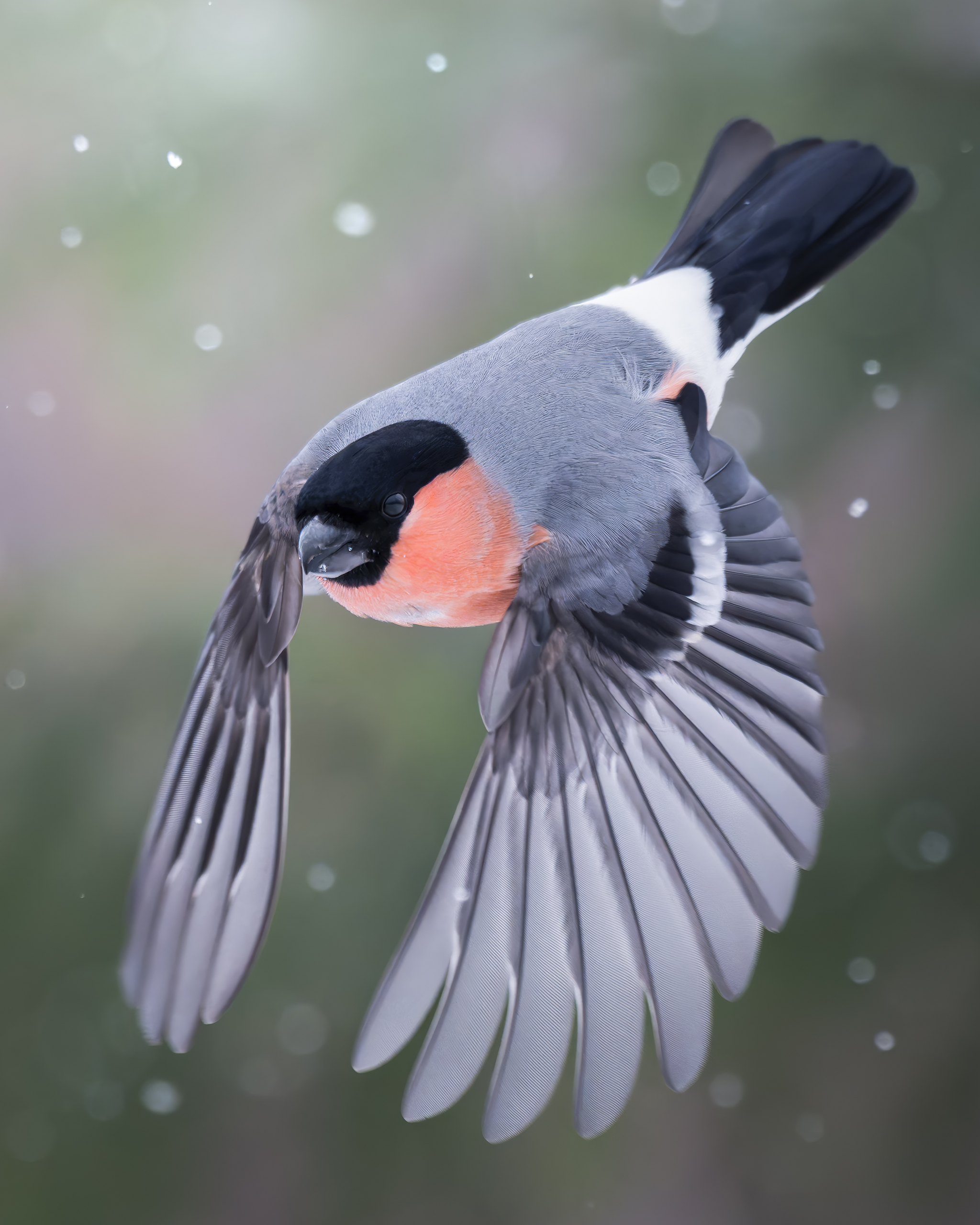Хорошо снятый снегирь в полёте — чёткие детали перьев, живая окраска, фон мягкий, снежинки добавляют атмосферы. Михаил уловил момент с умом.