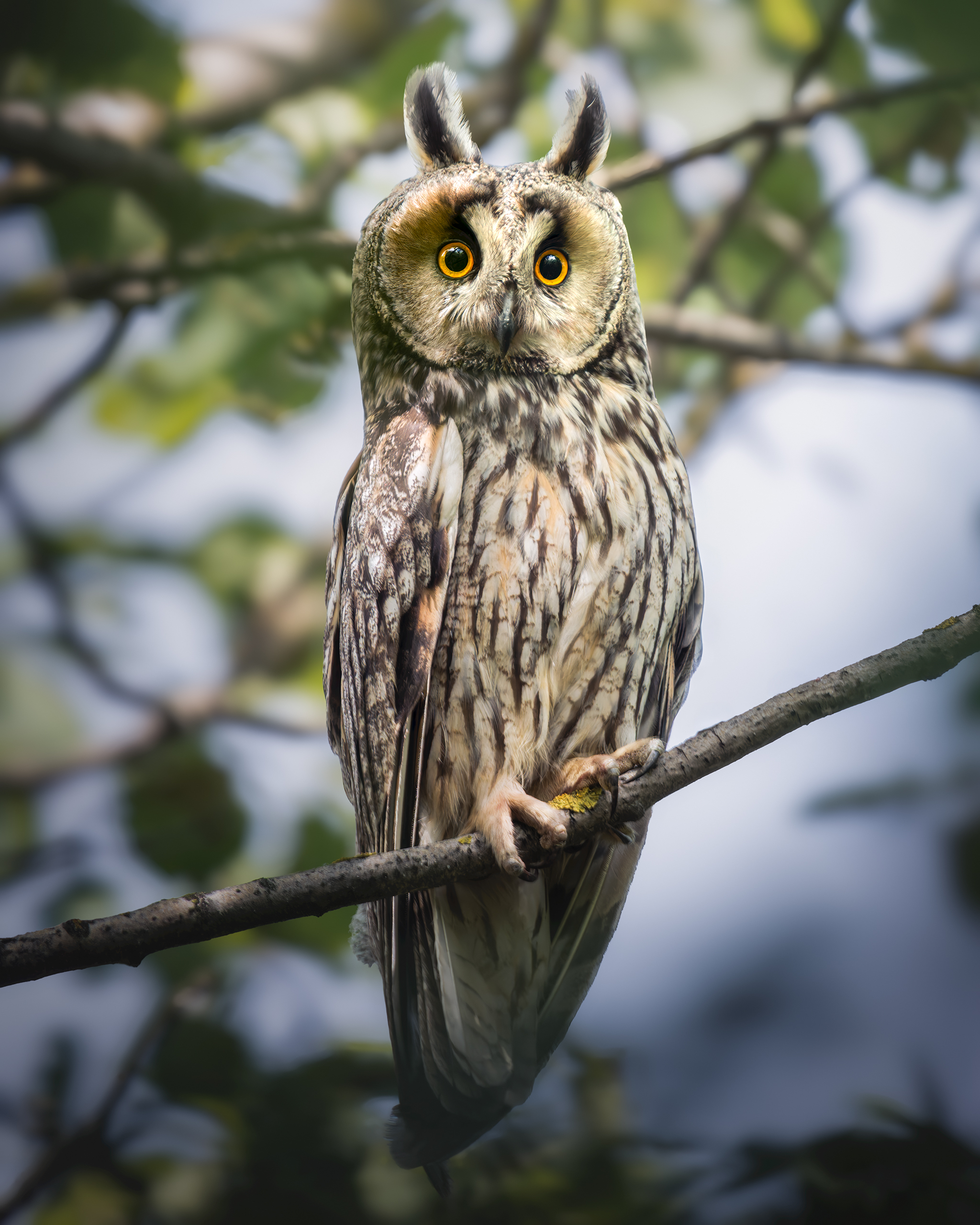 Сову видно чётко — перья, взгляд, посадка на ветке всё на месте. Фон размыт аккуратно, не отвлекает.