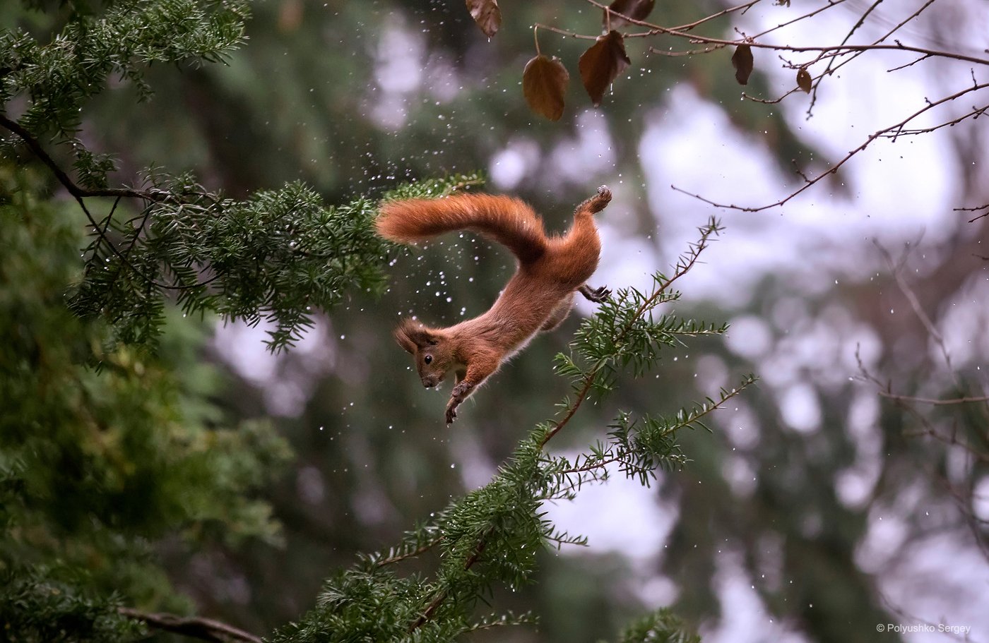 В тишине осеннего леса белка совершает рискованный прыжок — её тело изогнуто в арке, хвост выступает как руль в воздухе. Капли росы, оторвавшиеся от ветвей, застывают вокруг, словно сопровождая движение. Фотограф Сергей Полюшко запечатлел мгновение, когда природа раскрывает свою динамику и грацию. Это не просто прыжок — это танец выживания в дикой природе.
