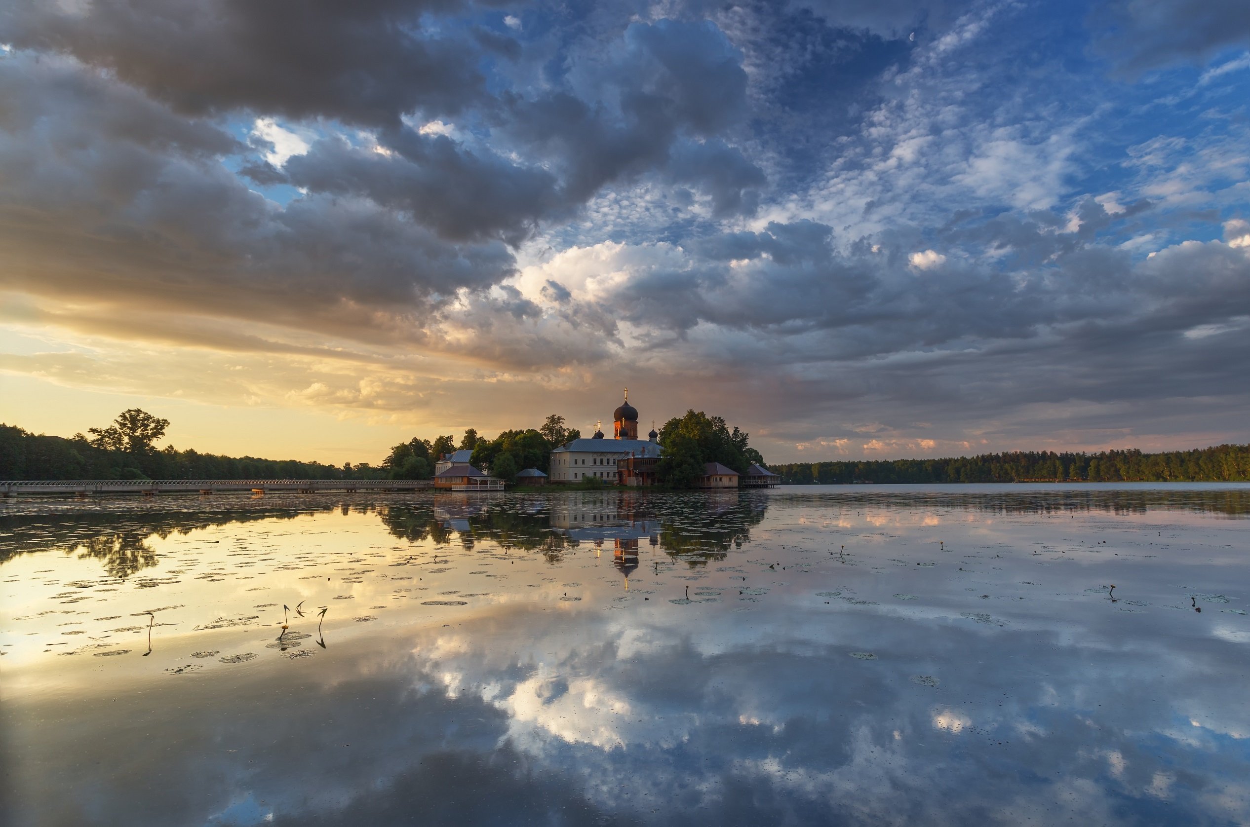 утро, Введенское, озеро, монастырь, рассвет, облака, Павел Попов
