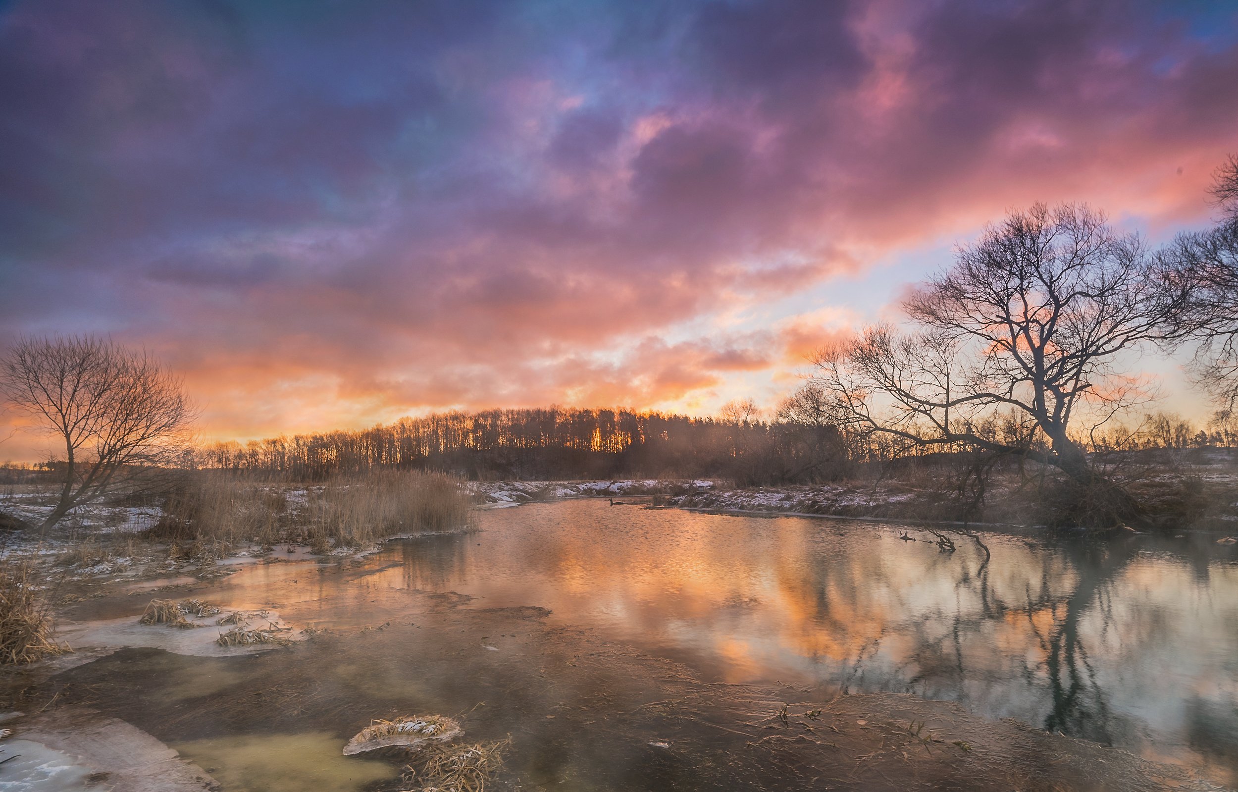 рассвет заря река небо беларусь пейзаж зима снег лес деревья февраль контраст панорама,, Попков Александр
