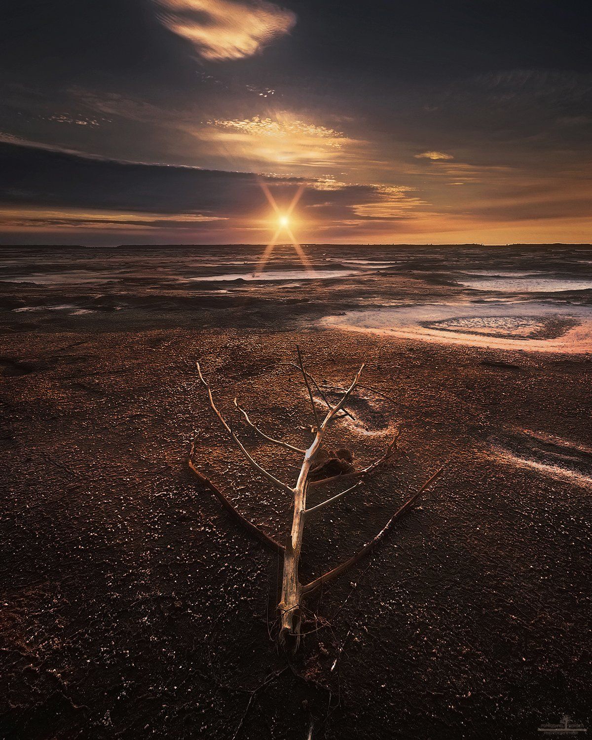 Вот и этот засохший кустик, расправивший свои ветви-рёбра навстречу солнцу, тоже, видимо, пал в неравном бою, сражаясь с солнцем и солёными ветрами…