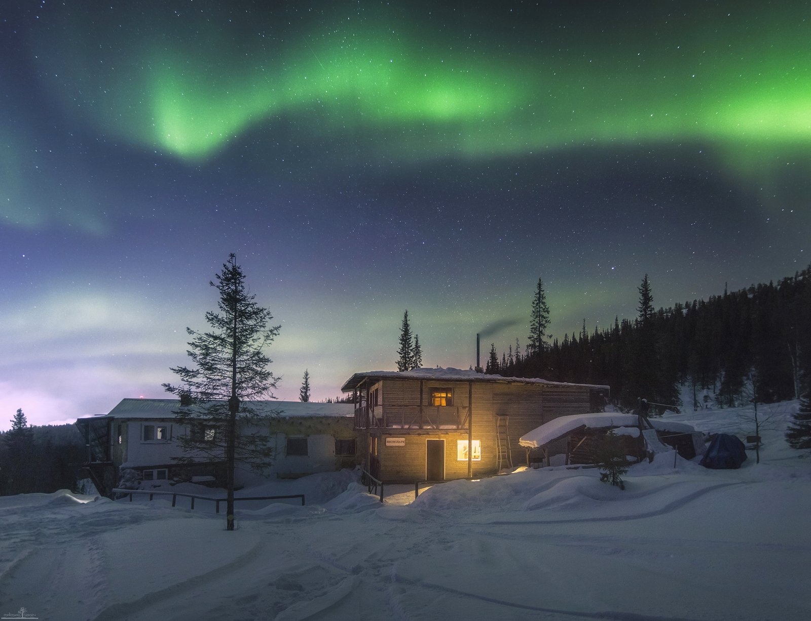 Эта ночь была сказочной. В нашем уютном домике печка попыхивала теплом, за окном трещал мороз, и ели укутывали свои мохнатые лапы в снежные одеяла. И небо, зимнее небо вспыхивало огненными лентами, дразнило зелёными драконьими хвостами, рисуя свою волшебную историю, от которой невозможно отвести глаза. В такие моменты как-то забываешь и про мороз, и про то, что нужно снимать.