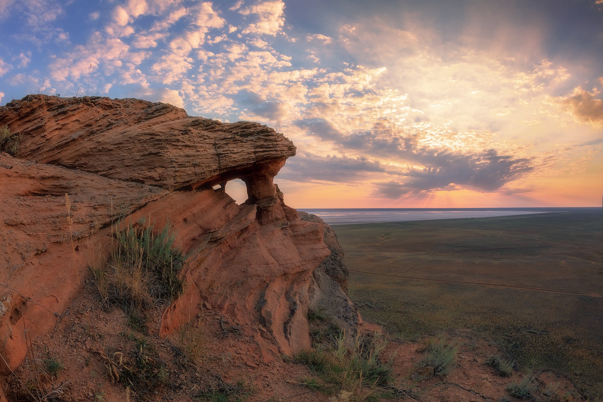 Каждому охотнику за солнцем нужен свой прицел. Кажется, свой я уже нашёл. На горе Богдо есть и не такое... Ветер и редкие в этих краях осадки обточили красные бока горы и, потихоньку разрушая её, наделали в ней пещер и замысловатых фигур.