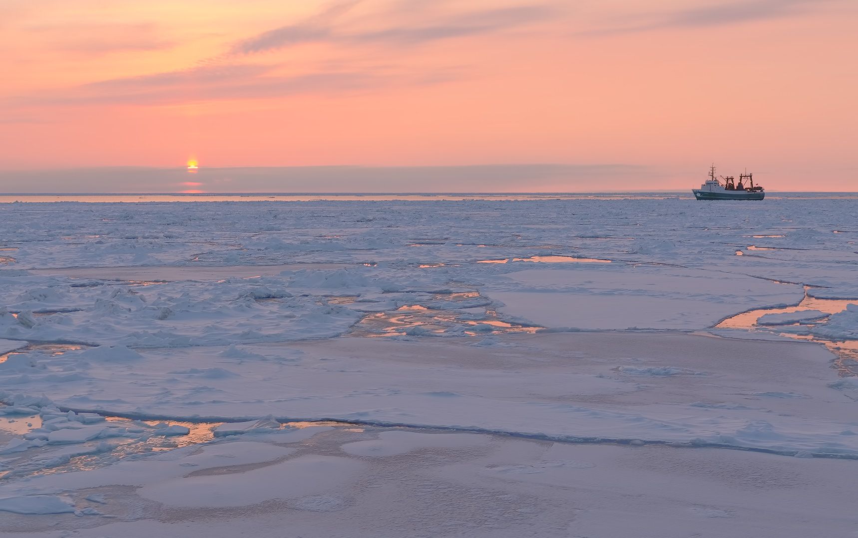 вечер, закат, охотское море, судно, льды, Евгений Паршуков