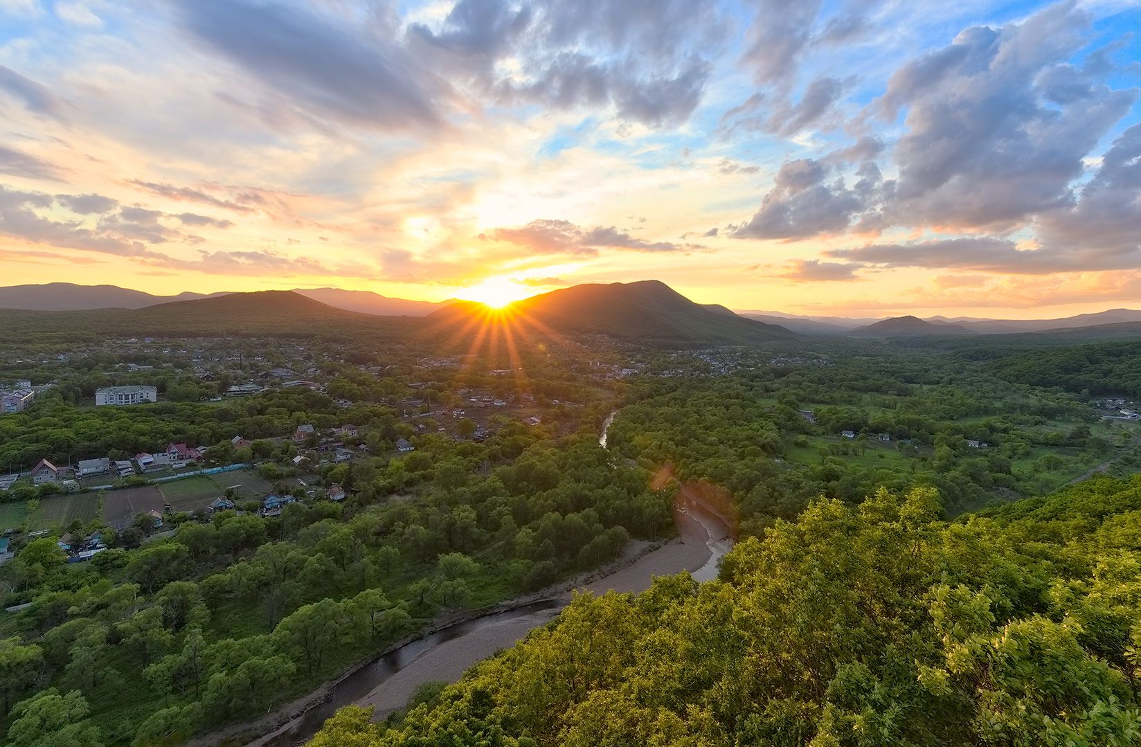 приморье, посёлок, река, лето, вечер, закат, горы, облака, Евгений Паршуков