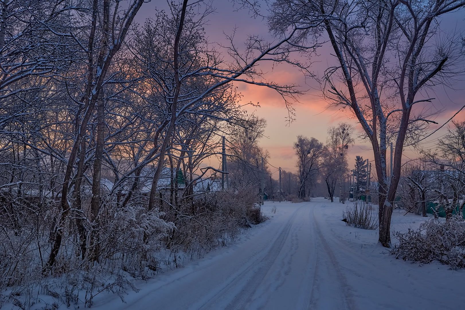 зима, утро, приморье, посёлок, дорога, небо, домики, Евгений Паршуков