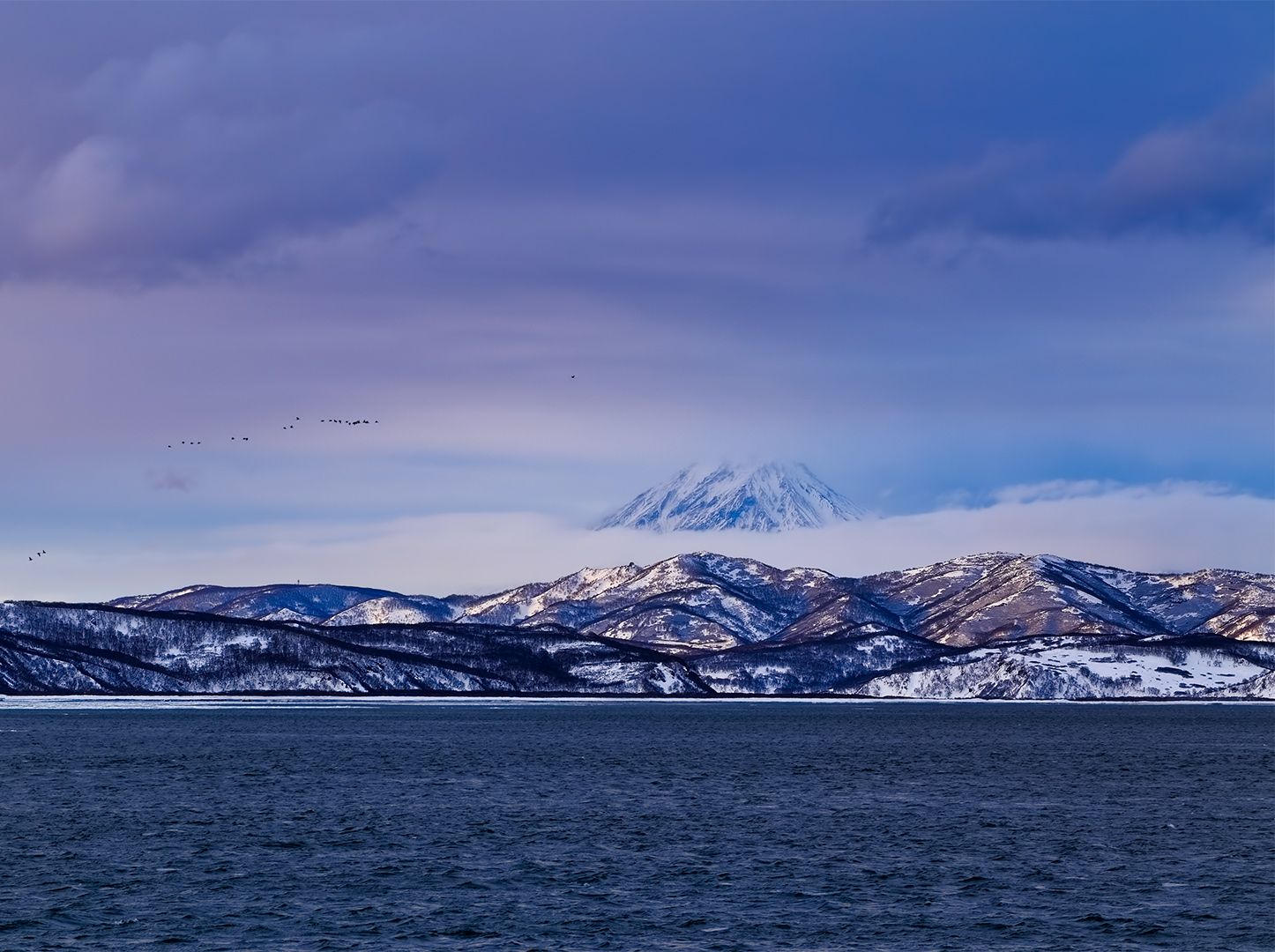 рейд, зима, камчатка, вулкан, утро, стая птиц, туман, Евгений Паршуков