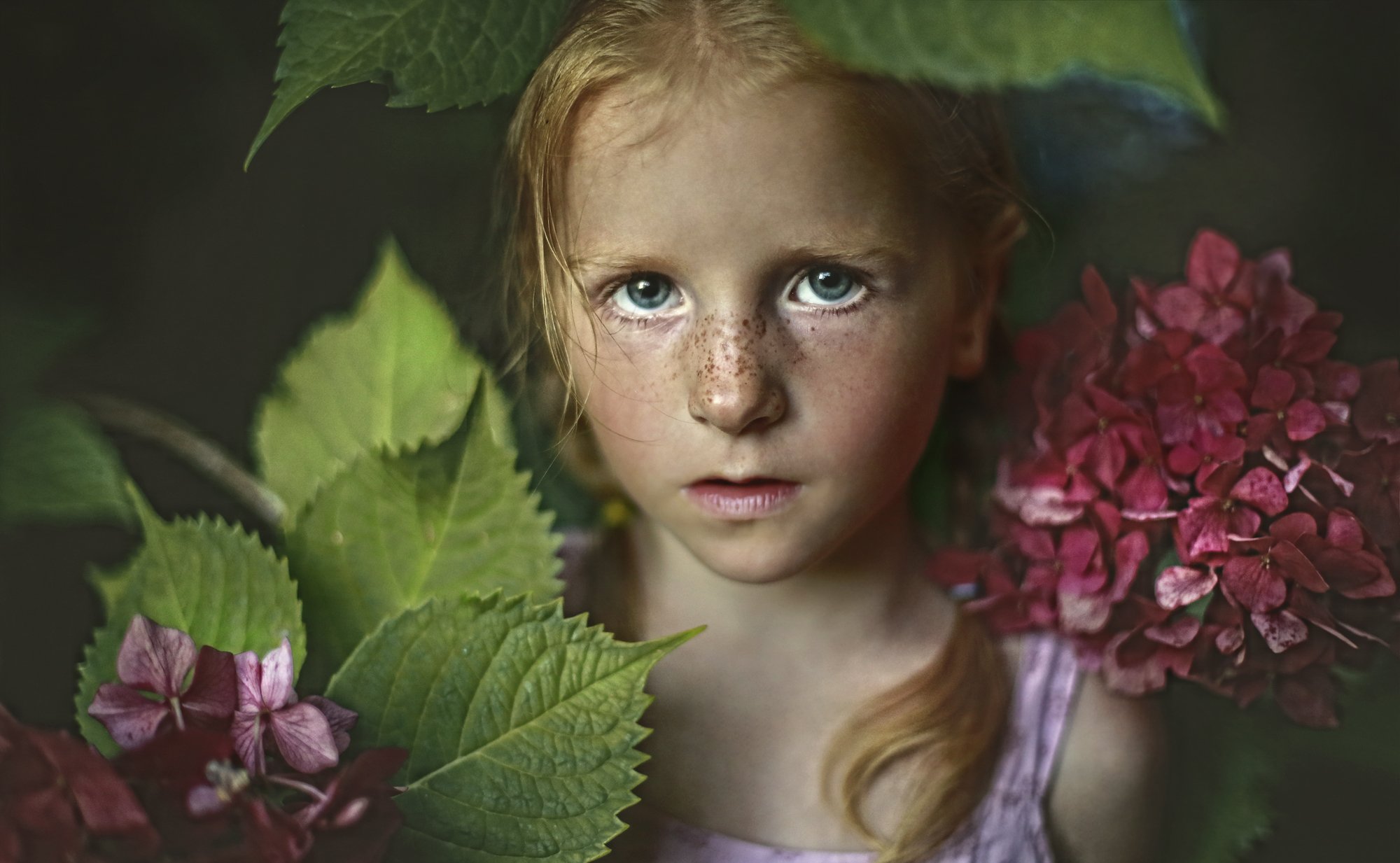портрет, девочка, глаза, взгляд, веснушки, жанр, жанровый портрет, свет, цвет, цветы, лицо, Постонен Екатерина