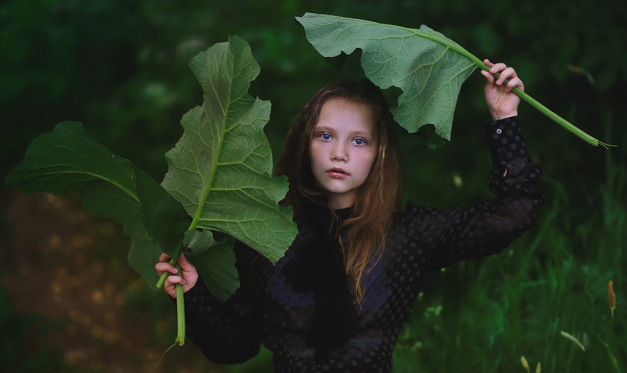 портрет, девочка, глаза, взгляд, лицо, листья, текстура, свет, цвет, жанр, Постонен Екатерина