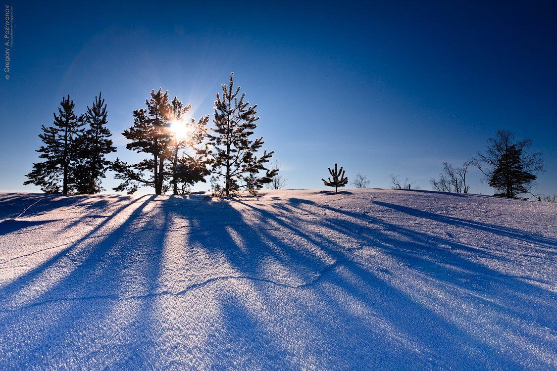 тени, полдень, зима, февраль, мороз, холод, снег, деревья, карелия, лехмалахти, Григорий Пожванов