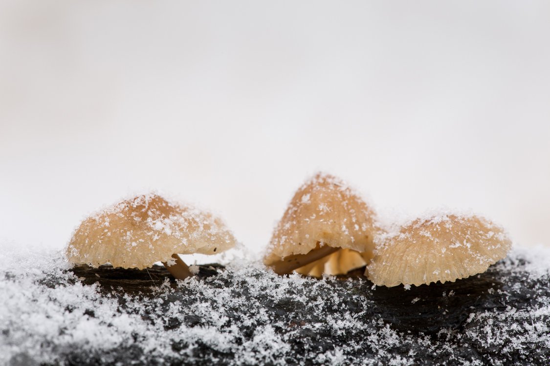 Условия: ISO 50, f/11, 1" Интересные грибочки я приметил накануне, и на следующий день собирался их сфотографировать днём, а не в потёмках. Однако на утро повалил густой снег, и толщина покрова всё росла и росла. Когда я дошёл до приметного места, ветку с грибочками завалило уже полностью, еле читались контуры на поверхности. Аккуратно разбросав снег сверху рукавичками, дальше я оттаивал грибочки с помощью дыхания. Освободив их из-под снежного плена, настроил аппаратуру и ждал, пока свежие крупинки снега будут заново укрывать моих моделей. Вам интересны секреты и технические приёмы макросъёмки? Приглашаю на большой практический мастер-класс по макрофотографии„Палитра весенней дубравы“ заповедник Белогорье,19–23 апреля Ведущие: Григорий Пожванов и Юлия ВтюринаУсловия участия и все подробности см. наwww.pozhvanov.com/macro2013a/