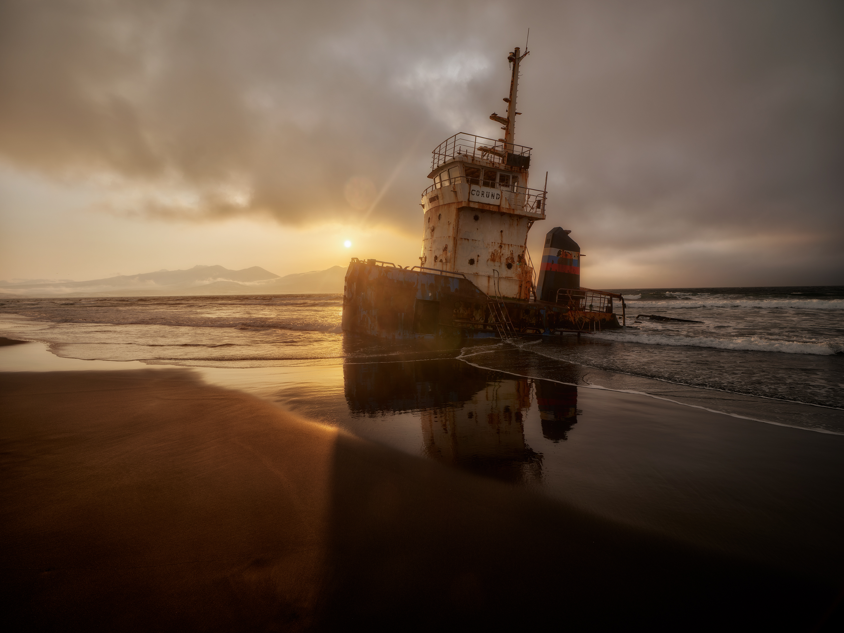 Good light, strong composition. The wreck in the wet sand with the sun low behind it — clean, moody, and well-timed. Reflections add depth without being flashy. Solid work, Ivan. 🌅