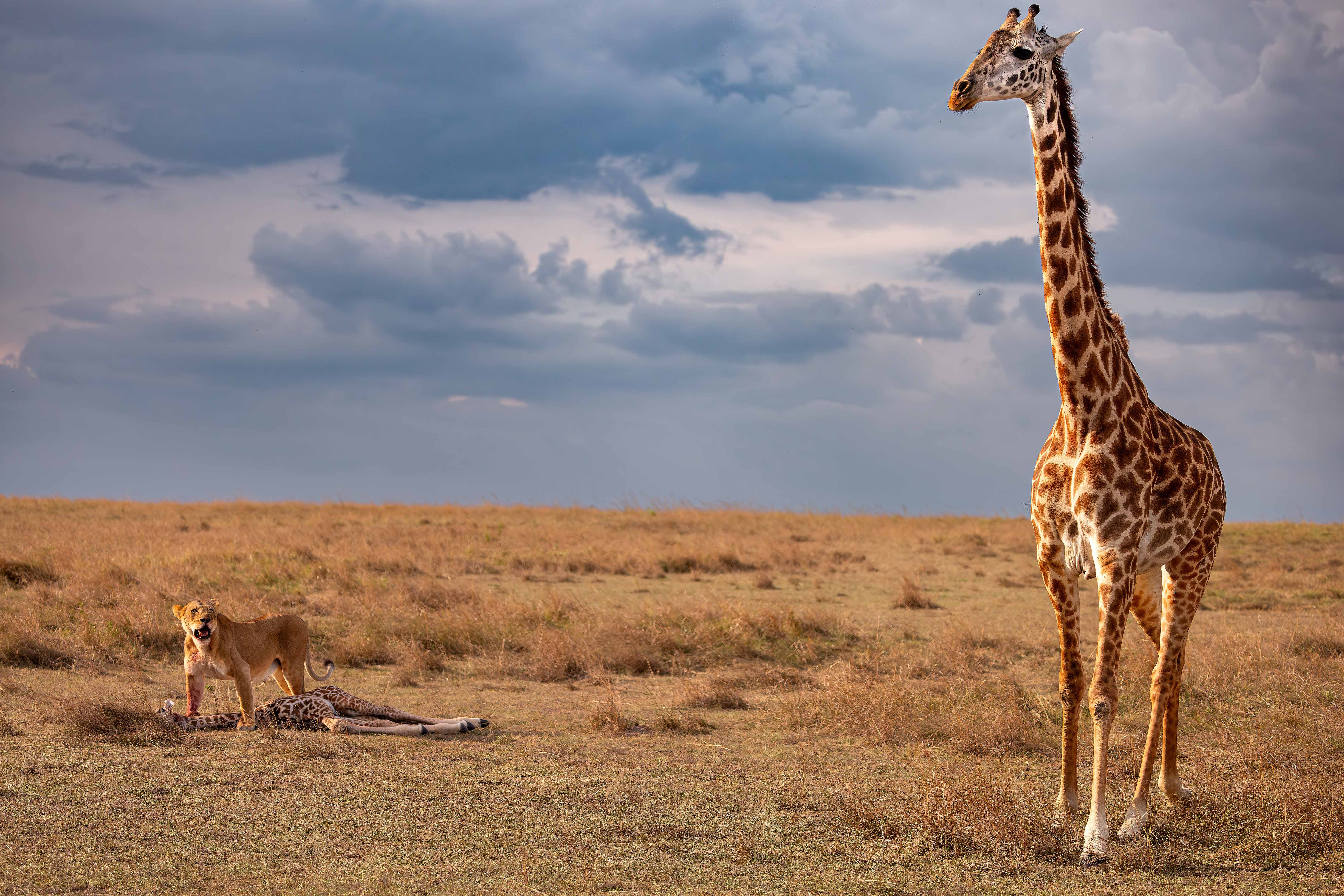 We were lucky to spot lactating female lioness pouncing on giraffe calf when its mother was not nearby. By the time the giraffe mother came for rescue of its calf, it was already too late..