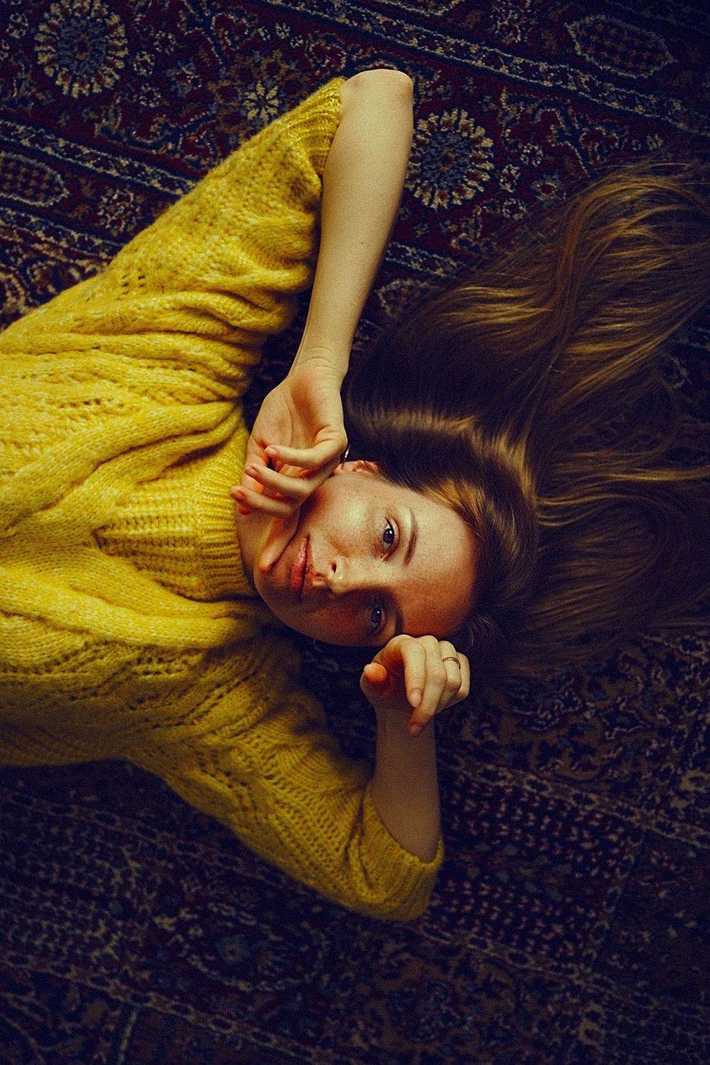 девушка на коврежелтый свитердевушка в свитеревеснушкисссррыжие волосыкрасивый взгляд