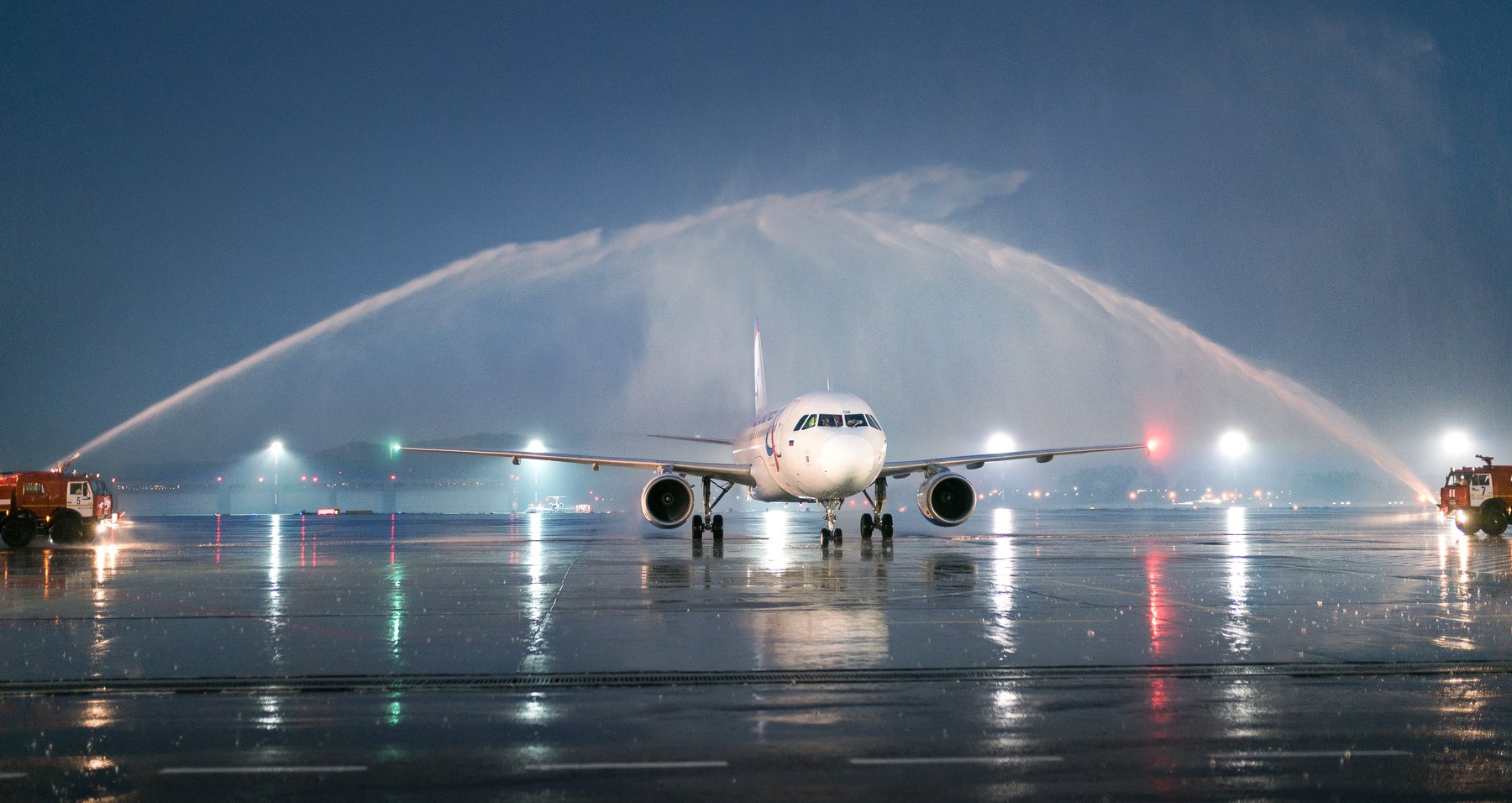 Мне 13 апреля в Международном аэропорту Сочи свезло встретить первый регулярный рейс авиакомпании «Уральские авиалинии» из Тель-Авива (Израиль). В честь этого события в аэропорту устроили одно из самых красивых и зрелищных традиций в авиации – «Водная арка», («Арка триумфа»).