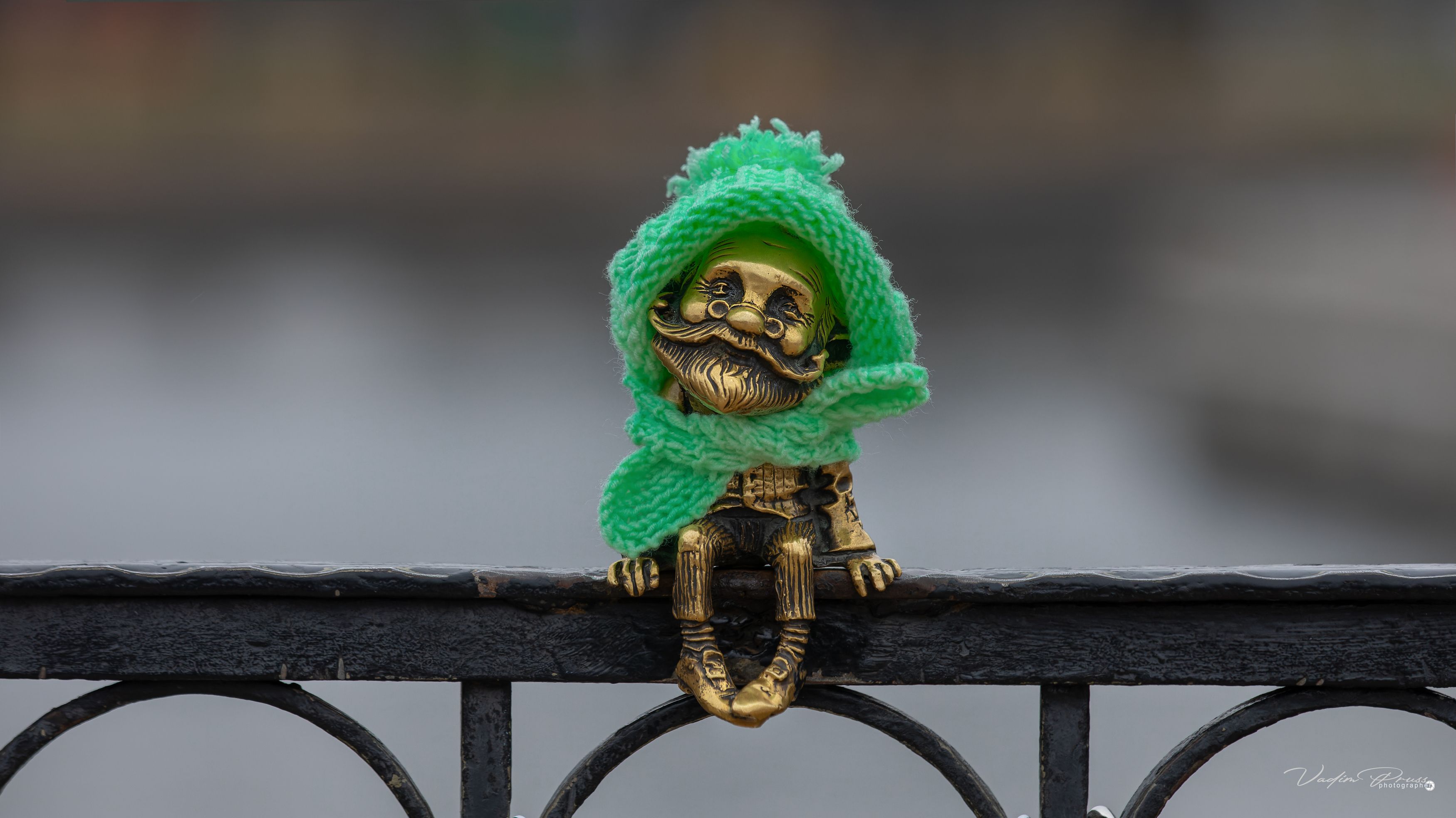 Достопримечательность города Калининграда это латунные статуэтки Хомлинов. Один из этих Хомлинов этот "Дедушка Хомлин" который установлен на перилах Медового моста. Когда холодно, энтузиасты надевают на этого Хомлина вязанные шапочки и шарфики.