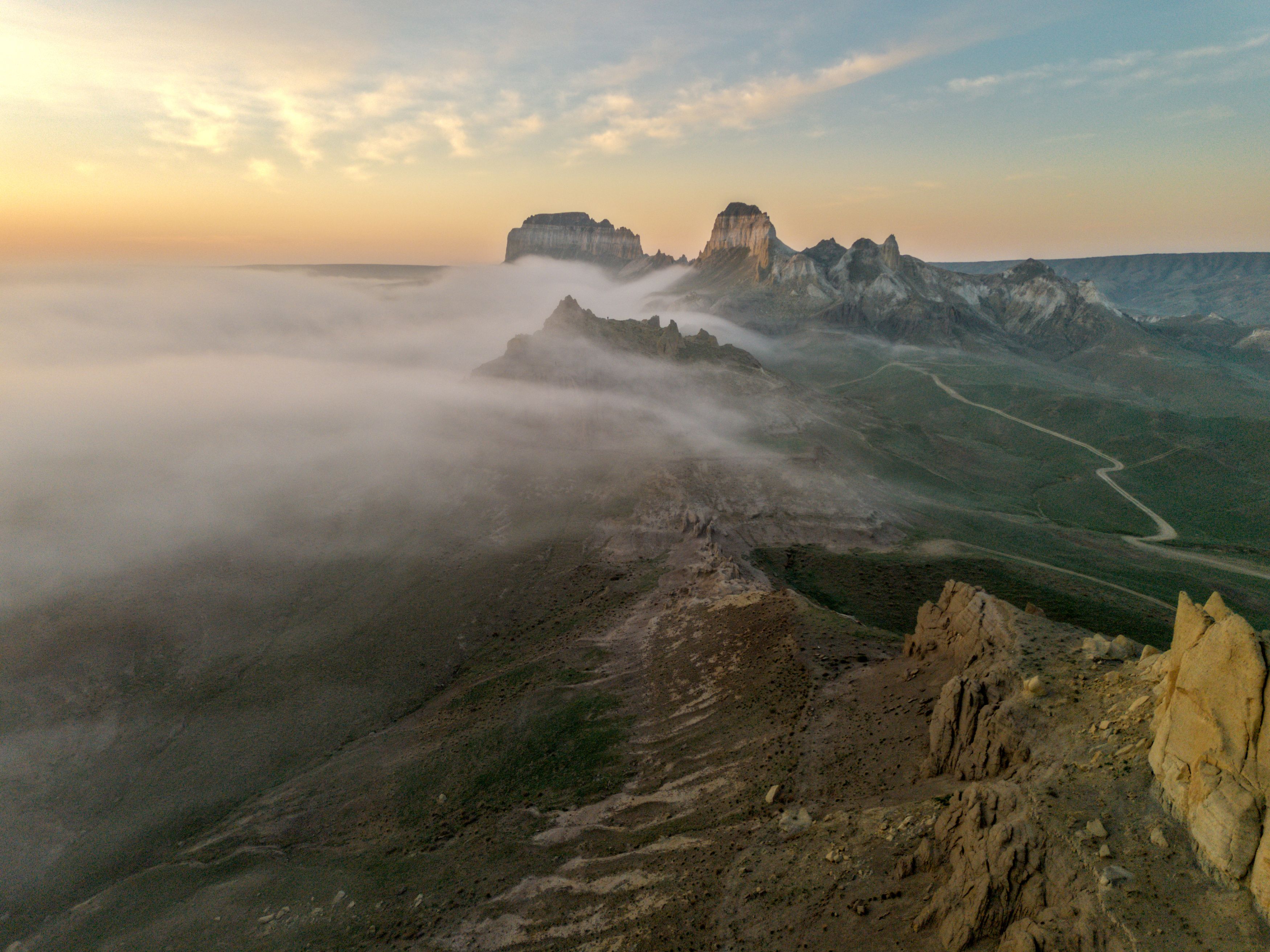 Утром пришёл туман. Не просто лёгкая дымка, а настоящий, густой, молочный. Он заливал долину, как море, оставив над водой только самые высокие «замки». С высоты птичьего полёта это выглядело так, будто я снимаю не Казахстан, а кадры из фильма про небесные царства. Я завис на месте и просто смотрел. Не мог поверить, что такое вообще возможно.