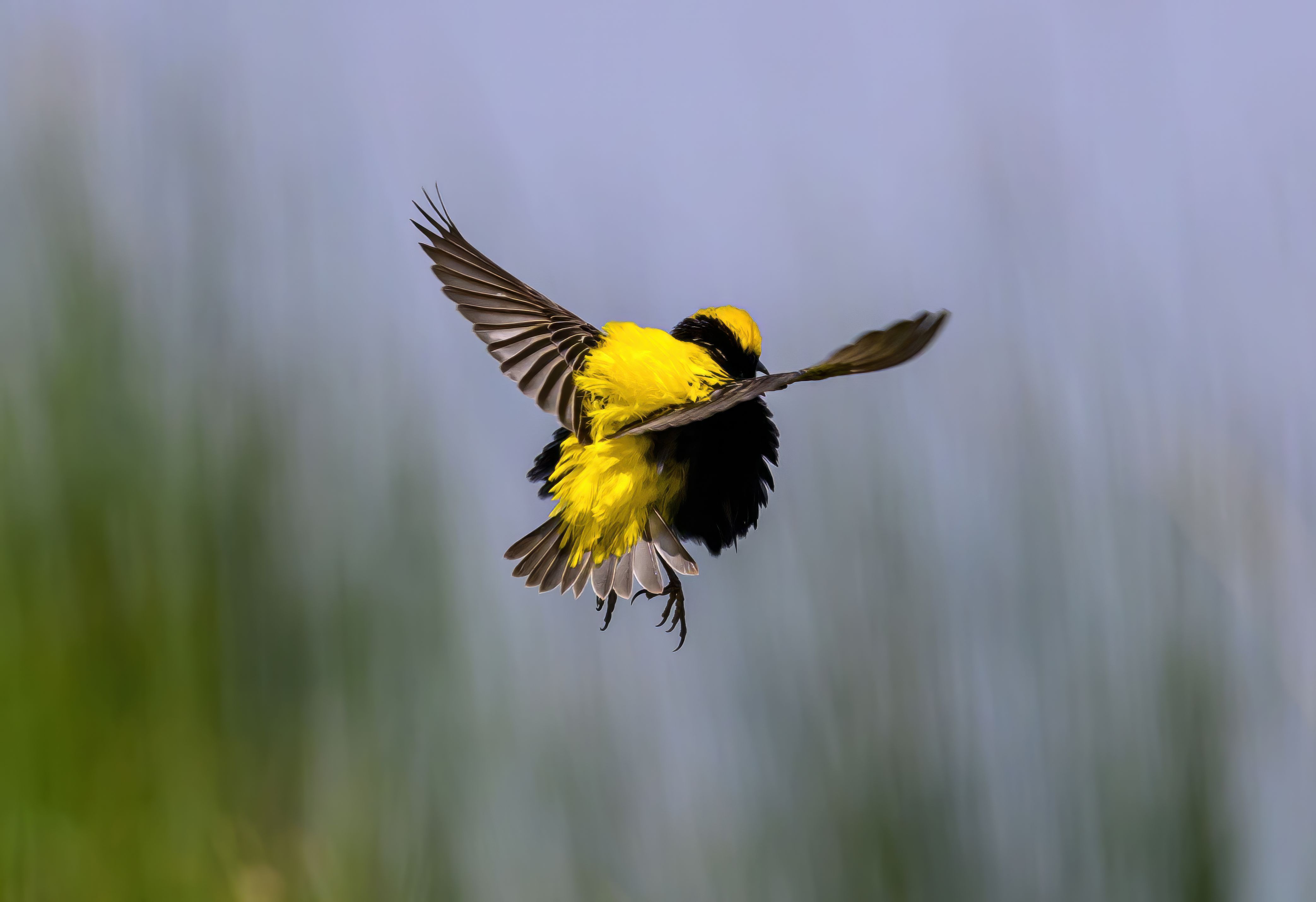 The demonstration flight of the Napoleon Weaver (Euplectes afer) resembles the flight of a bumblebee - the bird fluffs up all its feathers and buzzes loudly over its territory, attracting females and warding off males.