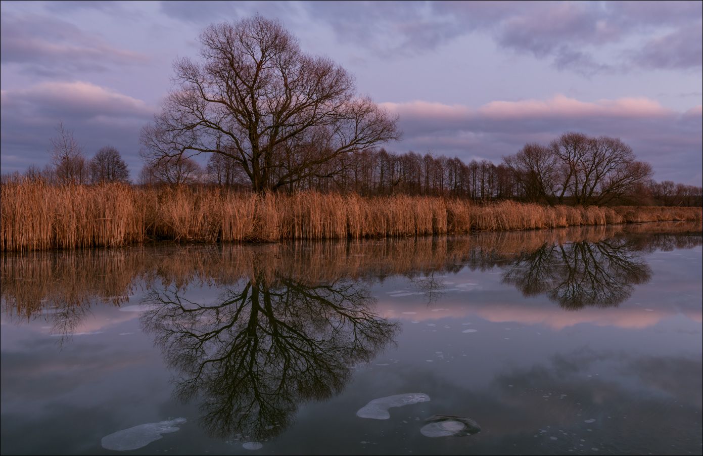 Тульская область, ноябрь прошлого года. Вечером, после дневных хлопот на участке, я решил съездить в это местечко, надеясь на закат. Когда я подошёл к водоёму, то просто обалдел и пожалел, что так поздно приехал. Такого я не видел никогда. То, что на льду был тонкий слой воды, это было ожидаемо, так как утром я снимал лесные пруды в тумане. Но такое количество замёрзших пузырей, да ещё и ковры водорослей на поверхности, и при этом ни какого ветра - это было полной неожиданностью. Нормальный закат так и не состоялся, но всё же слегка окрасил вертикали в свои красные тона. Отсняв это редкое и удивительное явление я очень надеялся вернуться сюда утром, но ночью выпал в небольшом количестве снег и стёр все картины, подтвердив лишний раз известную для меня истину - пейзаж не повторяется дважды.