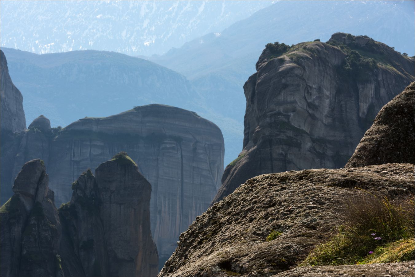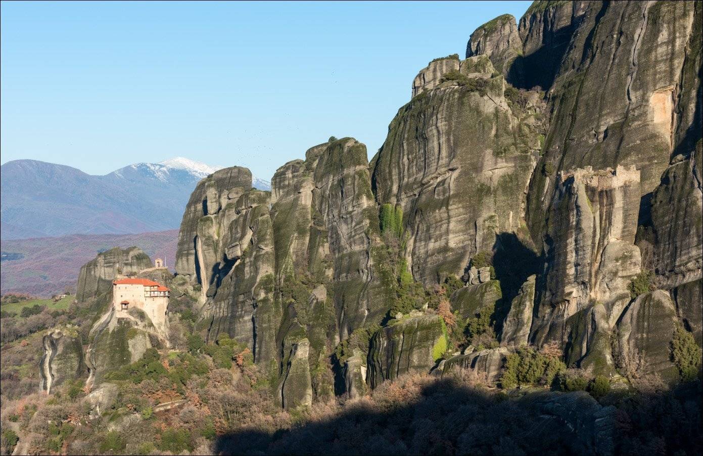Греция, Метеоры. Февраль 2017 года. Большие каменные столбы в долине реки, названные метеорами, стоят как некое чудо, непонятно откуда взявшееся. Возможно это пни, оставшиеся от периода кремниевой жизни на Земле, а может и нет, но выглядят странно. Религиозные деятели понастроили на вершинах некоторых из них монастыри, и сейчас это бойкое туристическое место по которому проходит хорошая автомобильная дорога. Обычно метеоры выглядят довольно серо, но после дождя лишайники на их поверхности ненадолго становятся зелёными и происходит удивительное преображение. Я этого не знал, и когда ехал туда ночью под дождём, не очень радовался. Но утром я был приятно удивлён. Это место необычное, и каждый человек с развитым воображением всегда найдёт много интересных образов в этих каменных столбах.