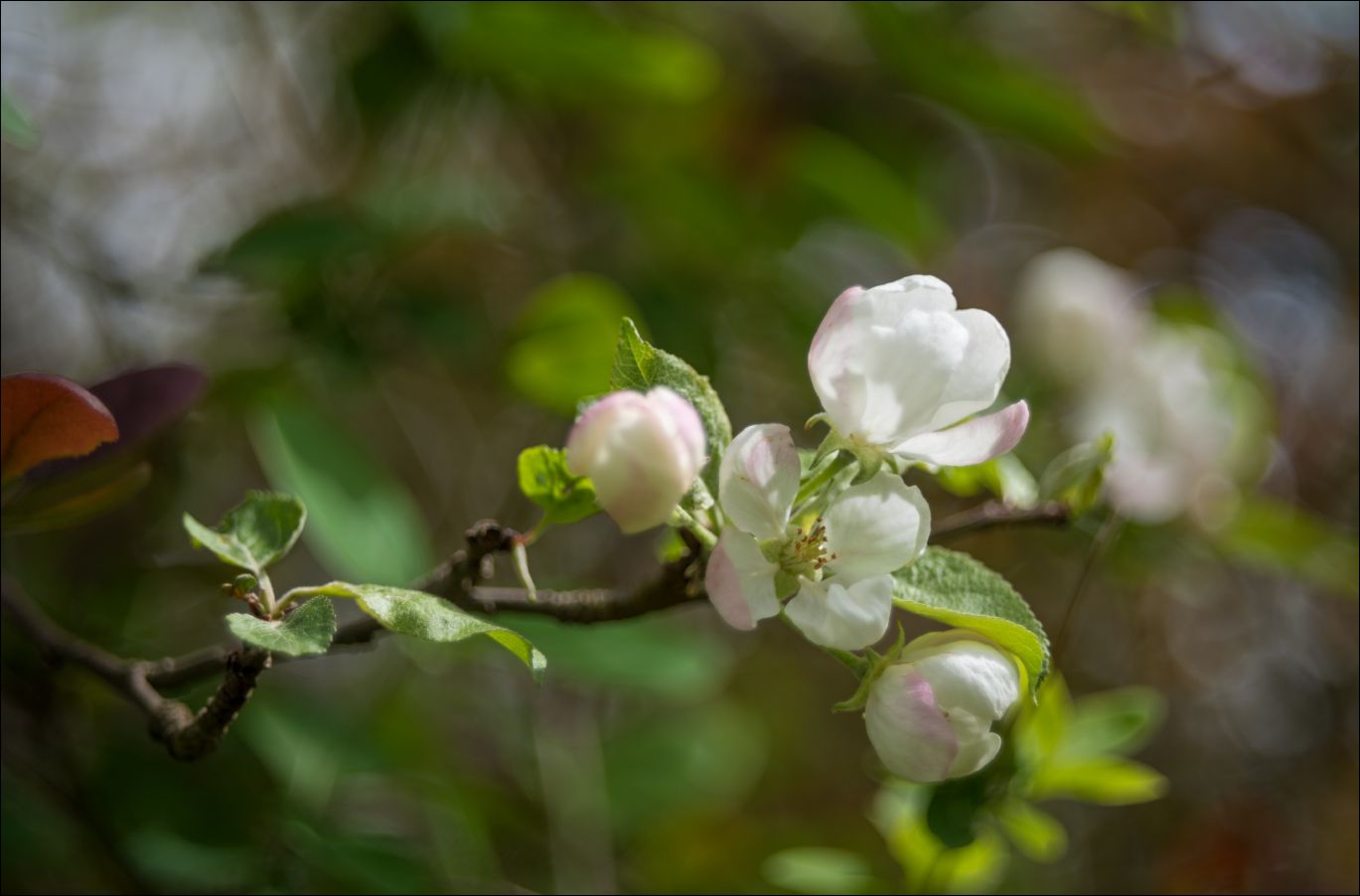 Основу подборки составляют фрагменты одной невзрачной придорожной яблони. Рядом стояло красиво и обильно цветущее дерево, но оно оказалось менее привлекательным для съёмки в таком стиле. Съёмка оказалась возможной благодаря рассеянному свету из-за облаков. Как только солнце вышло полностью, кайф пропал, хотя обычно именно солнца и не хватает.